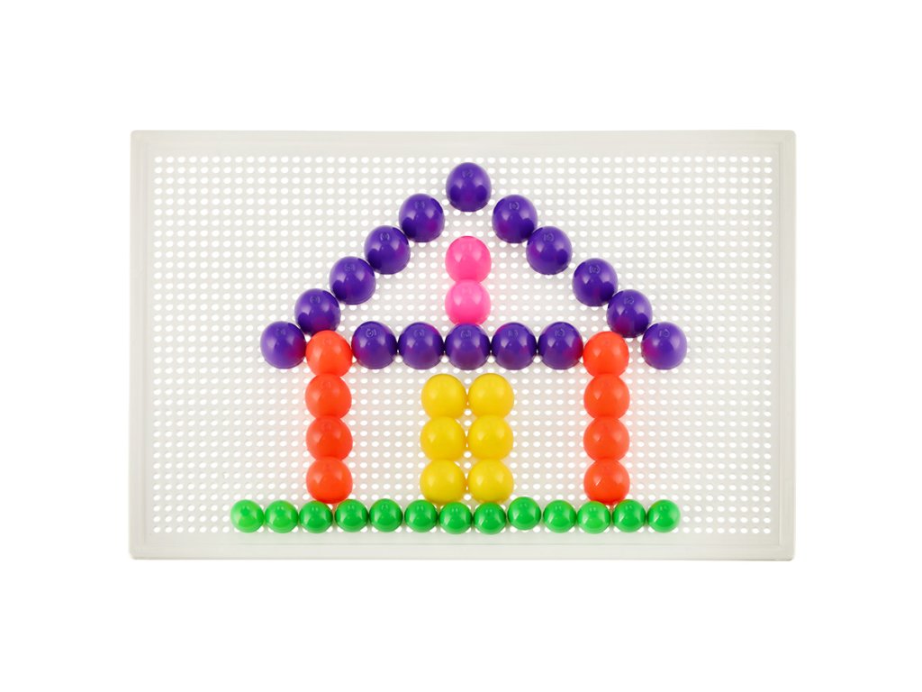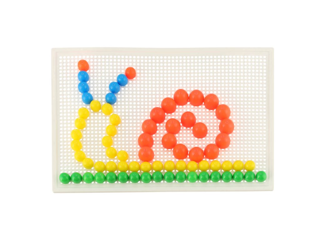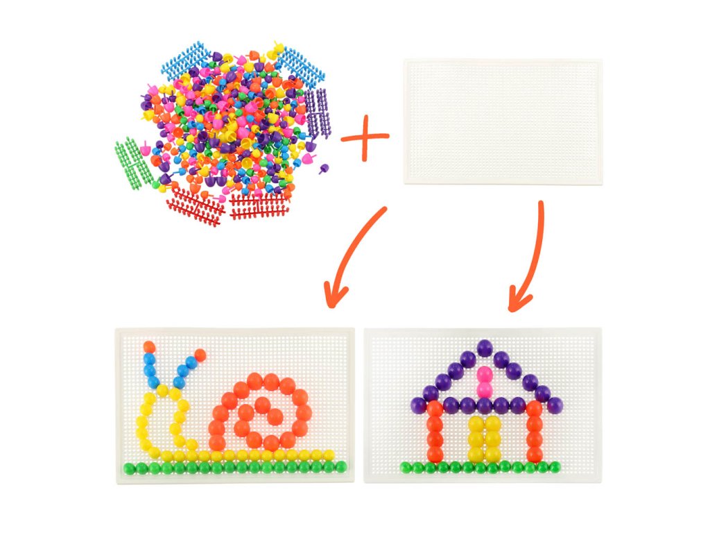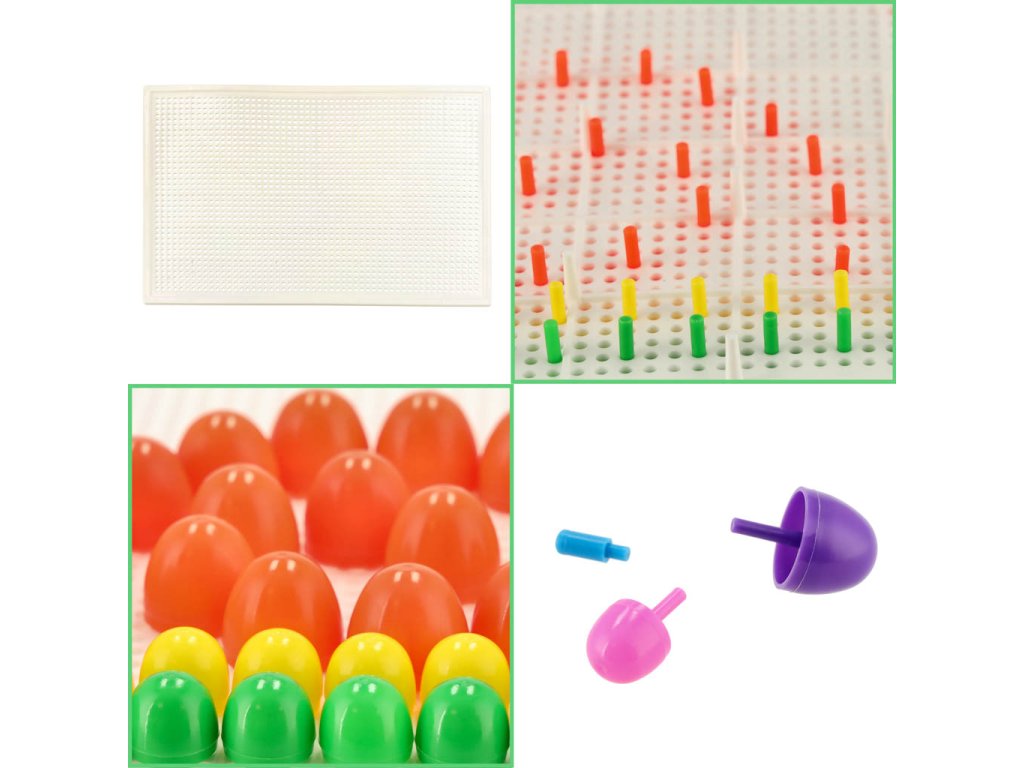 Skládá se z plastové desky s otvory (28,3 x 19,8 cm) a 600 kolíčků (v 7 barvách a 3 velikostech).