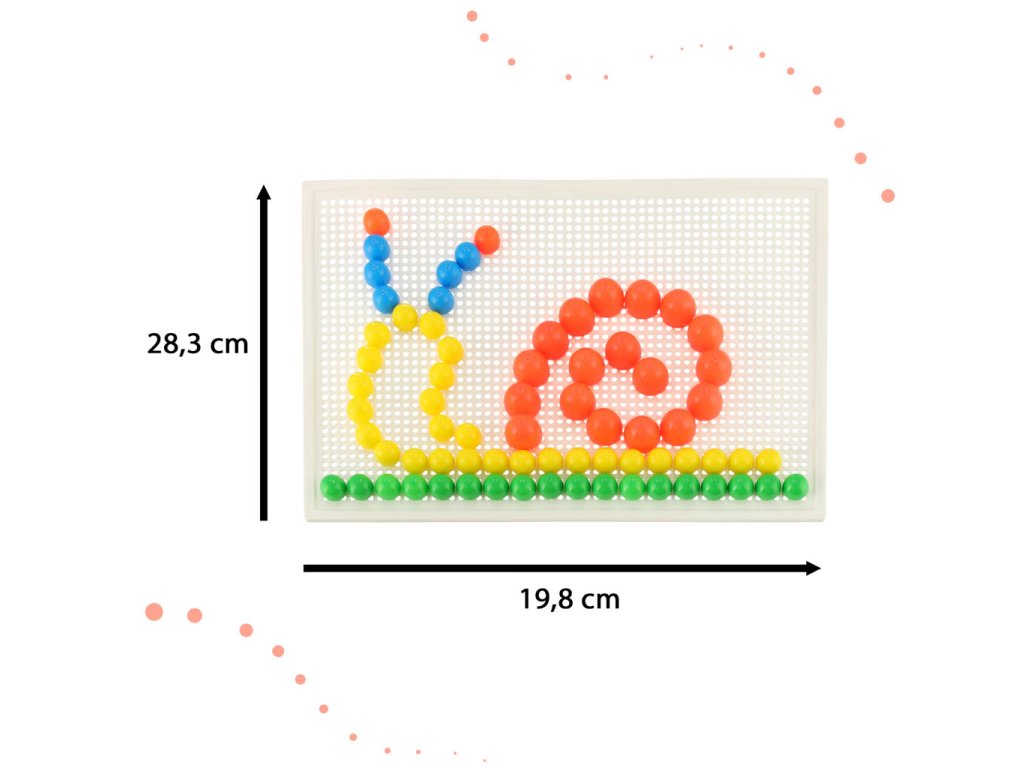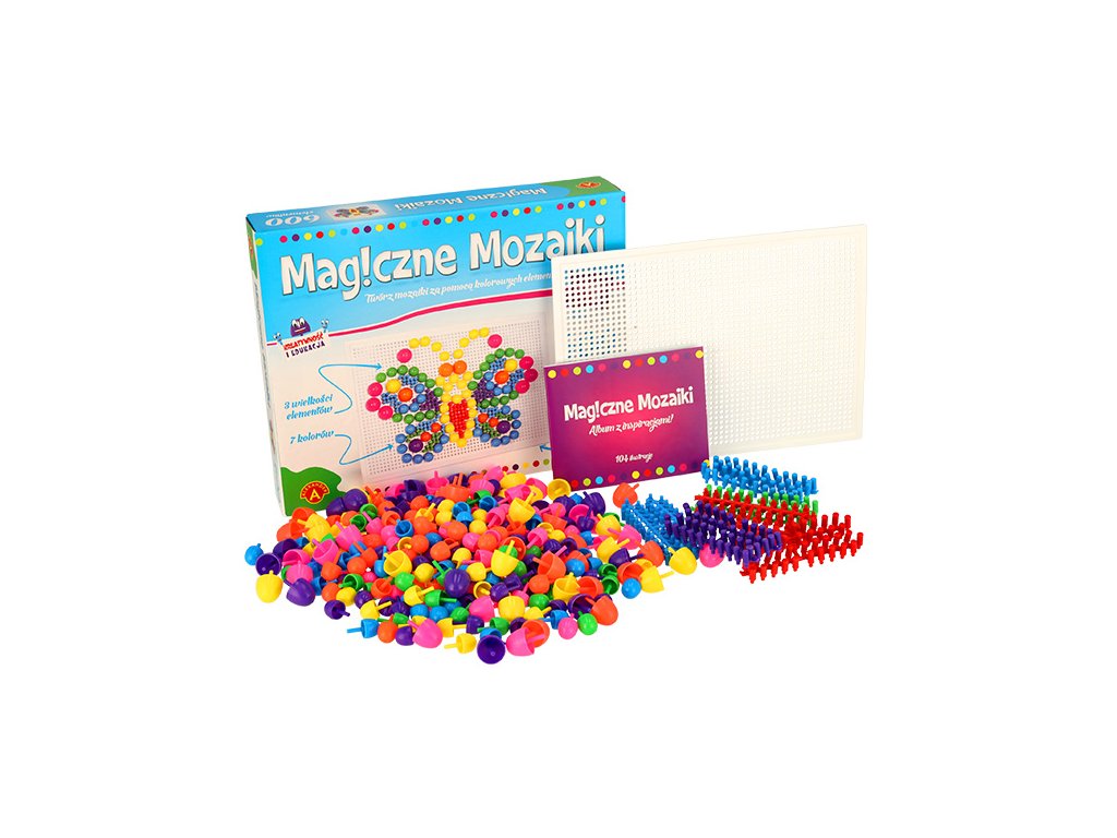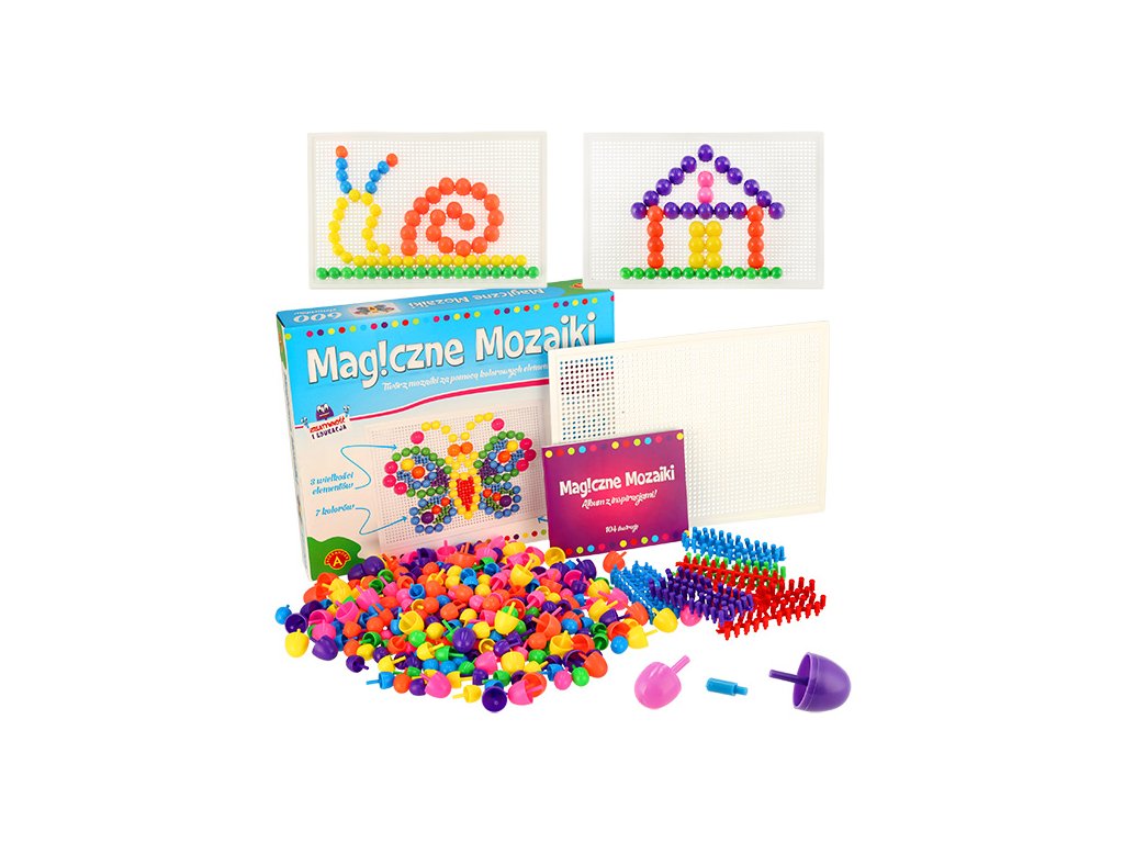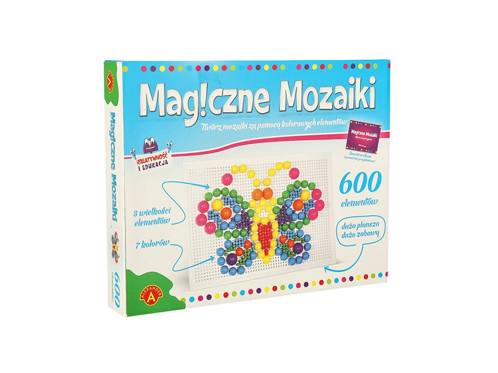 Kreativní hračka Magic Mosaic s 600 kolíčky a albem inspirace. Rozvíjí dětskou kreativitu a představivost. Obsahuje plastovou desku (28,3 x 19,8 cm) a kolíčky v 7 barvách a 3 velikostech. Ideální pro vytváření nekonečných obrázků.