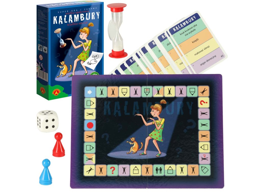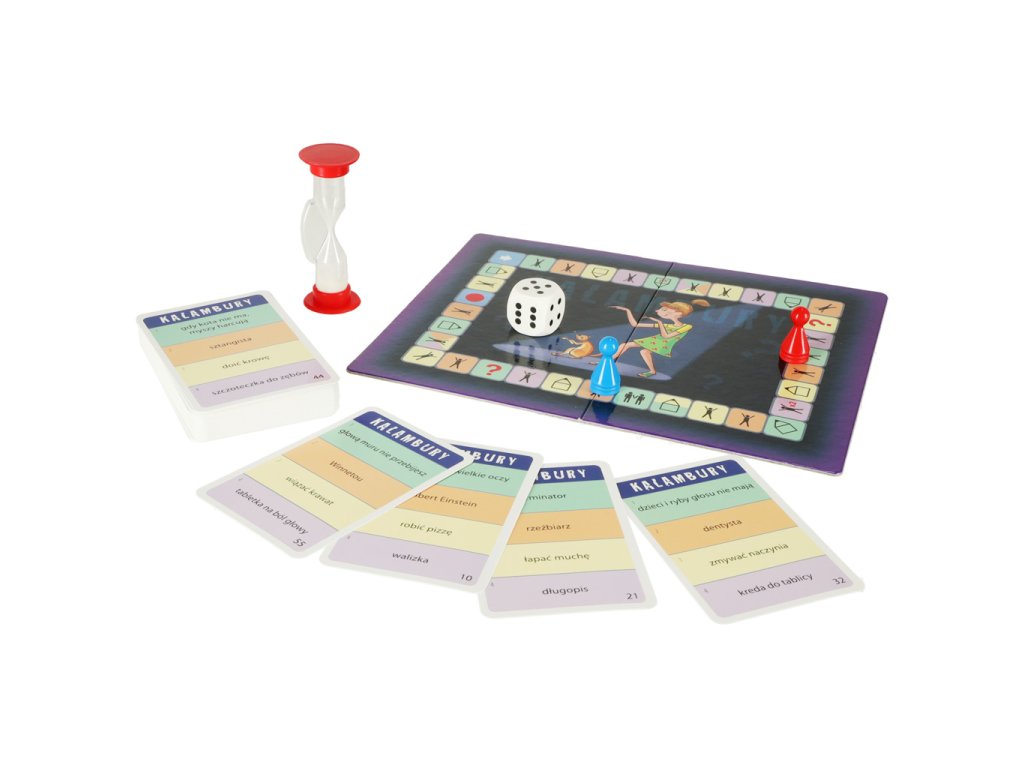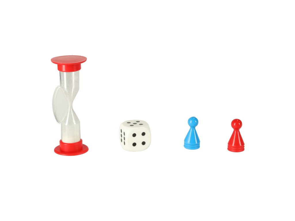 Oboustranné karty - 55 dílků, hrací deska, pěšáci - 2 dílky, hrací kostka, přesýpací hodiny, návod.