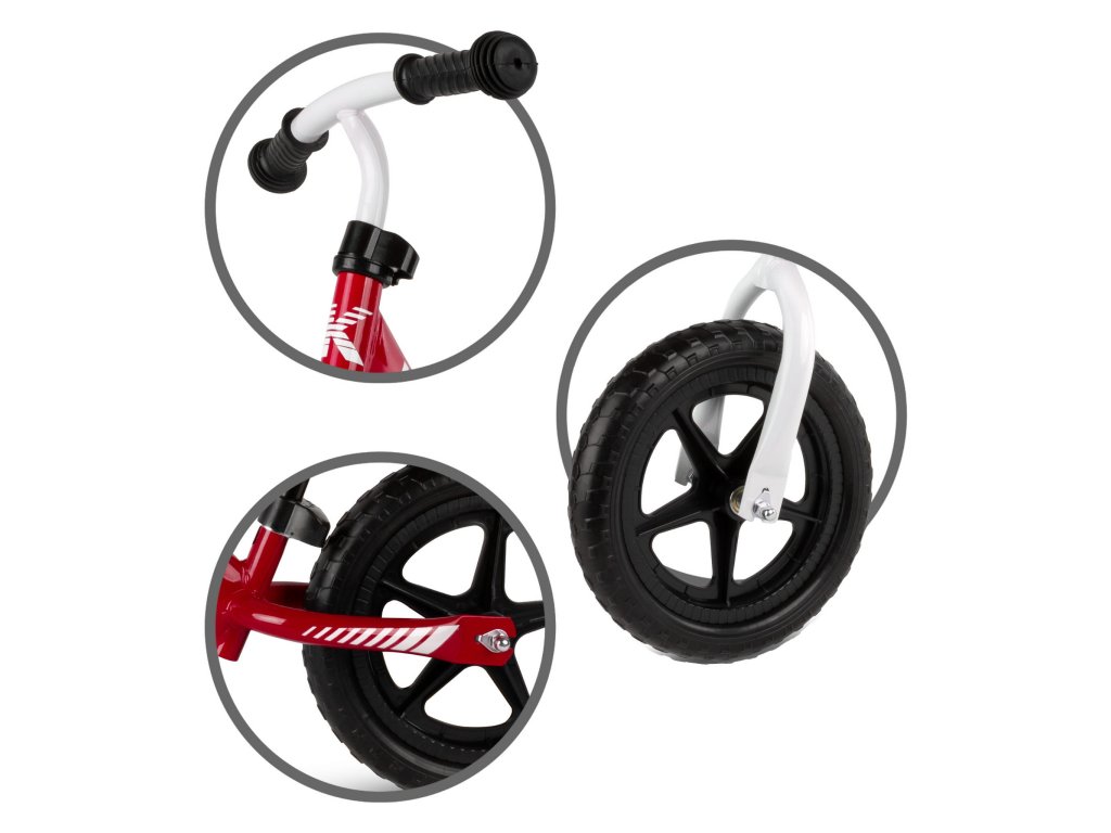 Balanční kolo má plně otočná řídítka s nastavitelnou výškou. V případě pádu se řídítka pod vahou dítěte sklopí do roviny, čímž se sníží riziko zranění.
