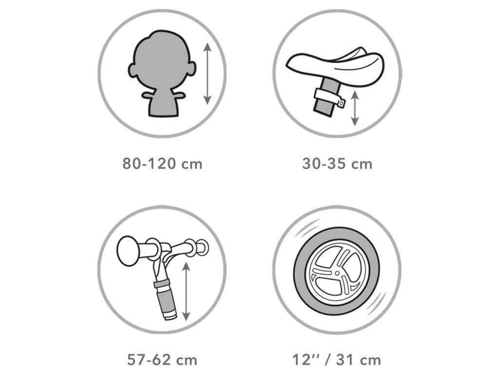 Plně výškově nastavitelný volant. V případě pádu se řídítka pod vahou dítěte sklopí na plocho, čímž se sníží riziko zranění