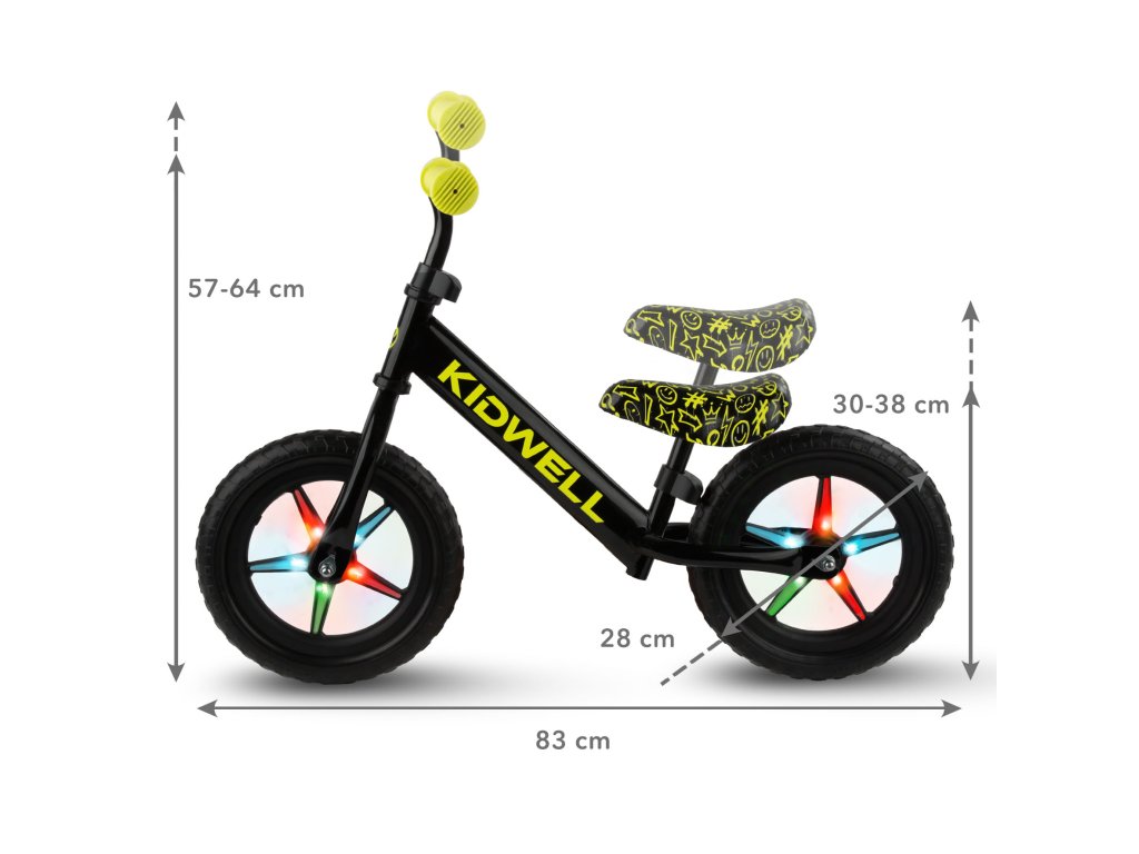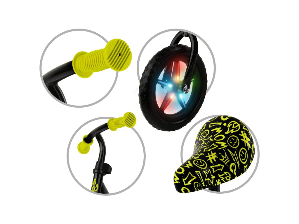 - Materiály:ocelový rám, kola z pěny EVA s vestavěnými a chráněnými LED světly, plastové díly
