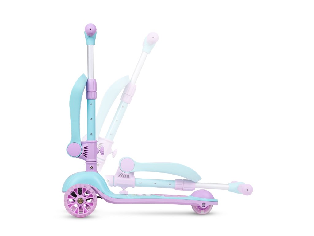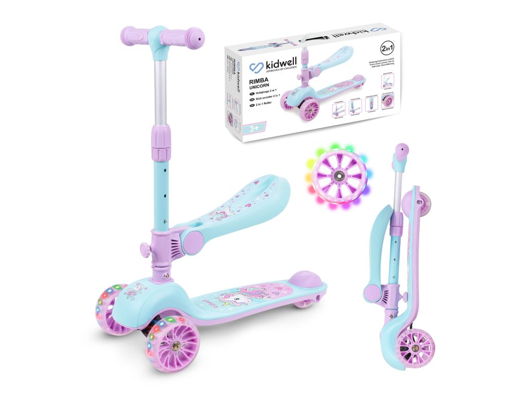 Jízda na koloběžce Kidwell;Rimba 2v1 je fantastický nápad pro aktivní trávení volného času. Stabilní a bezpečná koloběžka poskytne vašemu dítěti spoustu radosti a skvělé zábavy. Díky skládacímu sedadlu se koloběžka okamžitě promění v jezdeckou. Je to ideální volba pro malé děti, které začínají své dobrodružství s dopravními prostředky!