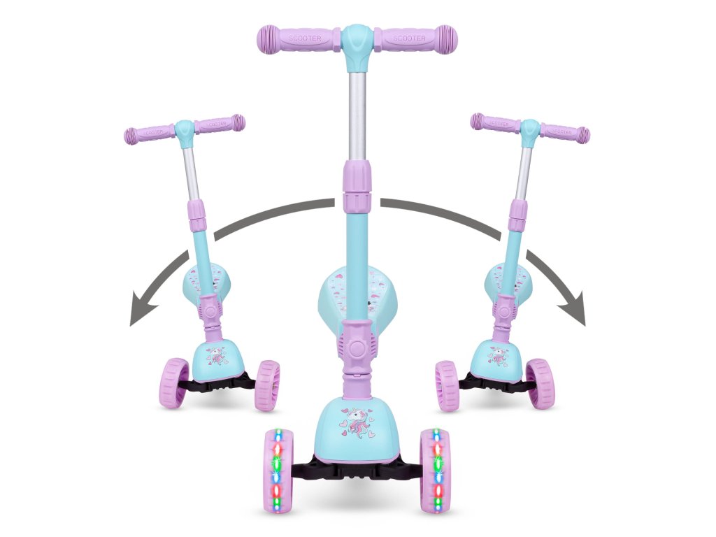 Pohodlná transformace bez použití nářadí! Pohodlný mechanismus pro změnu funkce umožňuje rychlou přeměnu z jízdy na koloběžku bez použití nářadí. Stačí odšroubovat pojistnou matici, poté zvednout sedátko a otočit jej o 180 stupňů kolem řídítek.