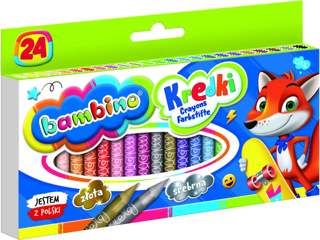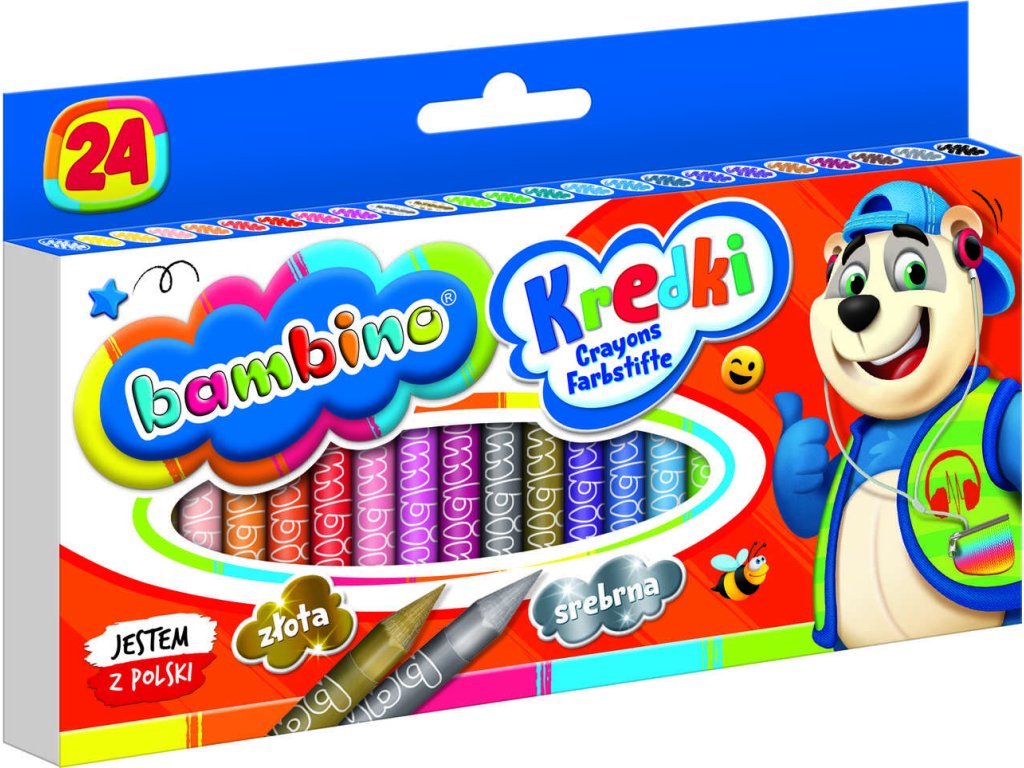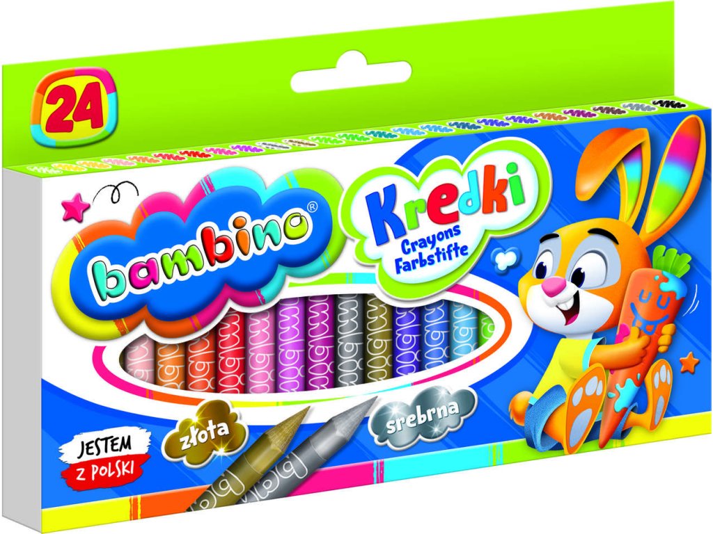 Pastelky BAMBINO s 24 barvami, vyrobené v Polsku z kaolinové hlíny. Intenzivní barvy, vynikající krytí povrchu. S ochranným papírovým obalem s různými zvířátky, ideální pro děti od 3 let. Splňují bezpečnostní normy.