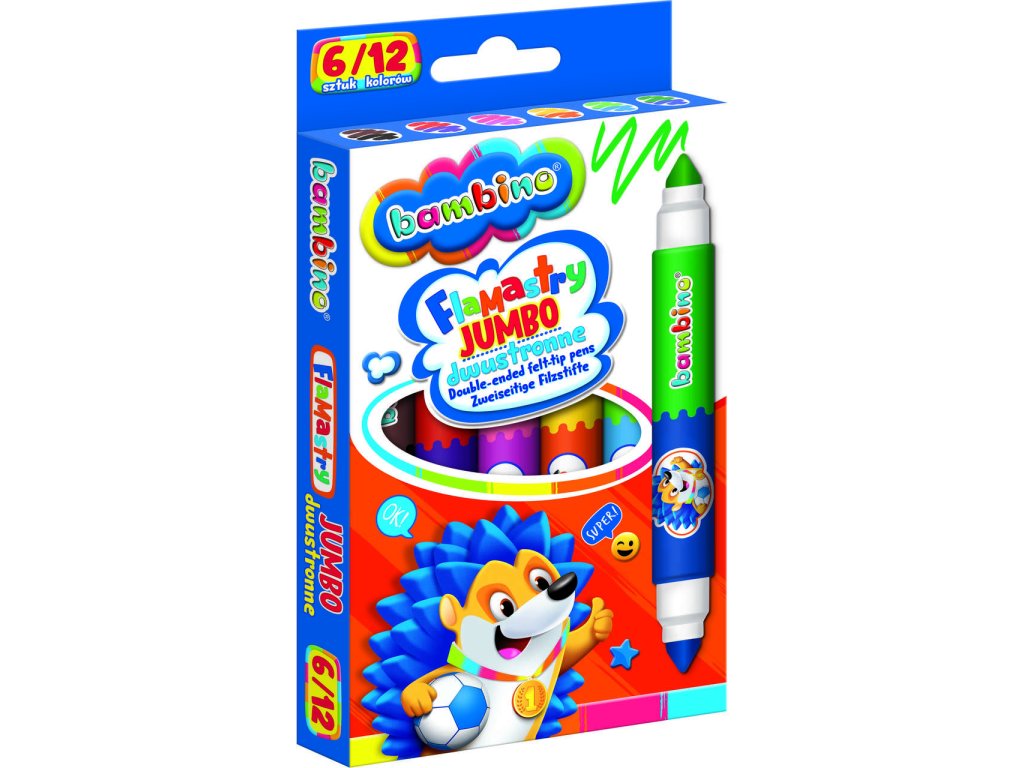 Oboustranné popisovače Jumbo BAMBINO s 6/12 barvami. Intenzivní barvy, dlouhotrvající a snadno omyvatelné z oblečení. Splňují bezpečnostní normy. Balení obsahuje 6 kusů. Velikost popisovače: 14,5 cm. Ideální pro kreativní děti!
