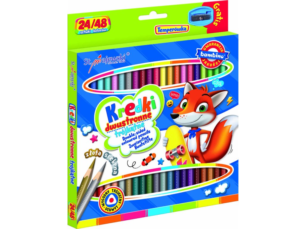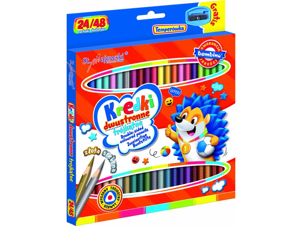 Vylepšené tužky pro děti: 24/48 barev, oboustranné, trojhranné. Kvalita garantovaná společností Bambino, bezpečné podle evropských norem. S bonusem - ořezávátkem.