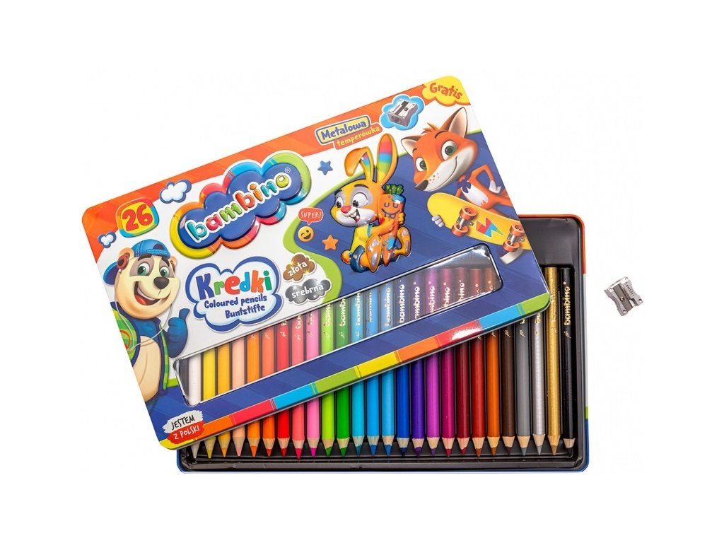 BAMBINO tužky v dřevěném rámečku 26 barev + ořezávátko, kovová krabička