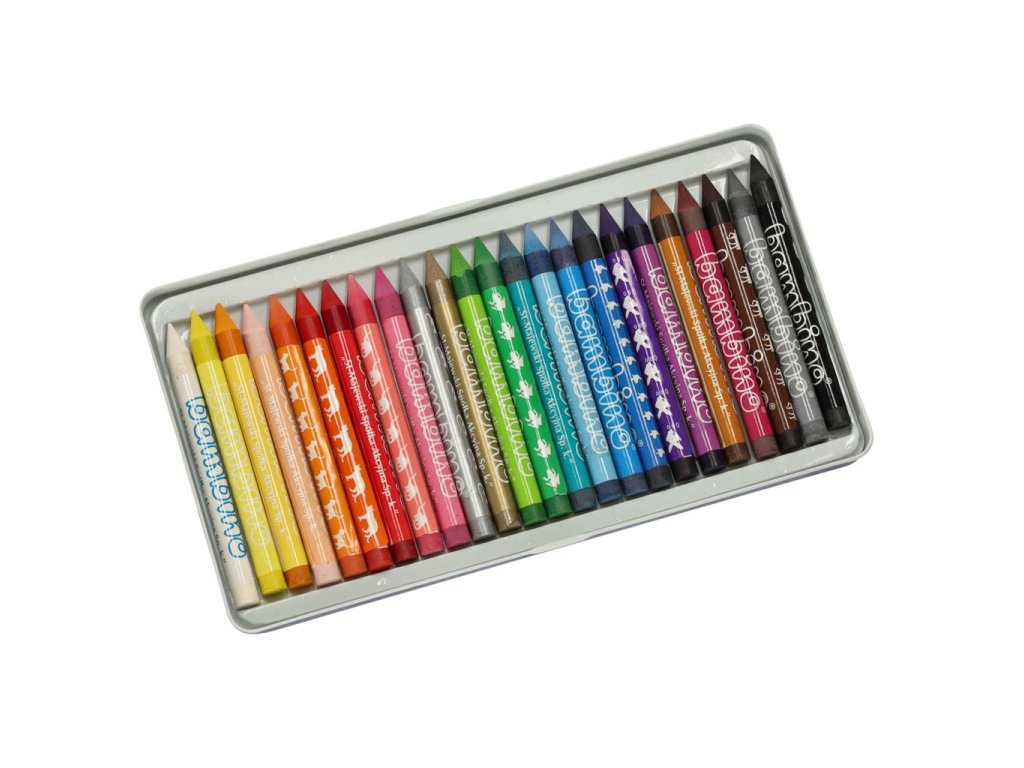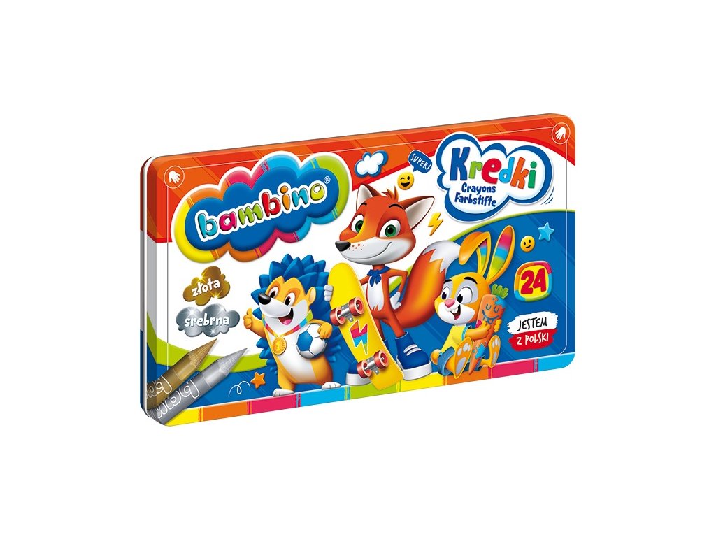 Pastelky Bambino v kovové krabičce, 24 barev + ořezávátko. Vyrobeno v Polsku z kaolinové hlíny s intenzivními barvami a vynikajícím krytím. Ideální pro kreslení a tvoření pro děti od 3 let. S jednotlivými obaly s motivy zvířat a zlatou a stříbrnou pastelkou.
