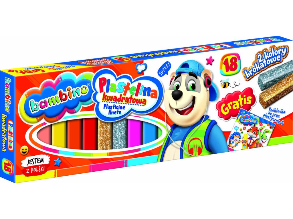 Plastelína BAMBINO - 18 barevných odstínů, pružná a snadno tvarovatelná. Intenzivní barvy, nelepí se a nezanechává špinavé ruce. Ideální pro vytváření millefiori děl. Bezpečná pro děti, splňuje požadavky směrnice EU o bezpečnosti hraček. Součástí jsou také třpytivé barvy. Hmotnost 18 g, rozměry 30,5 cm x 9,5 cm x 1,5 cm.
