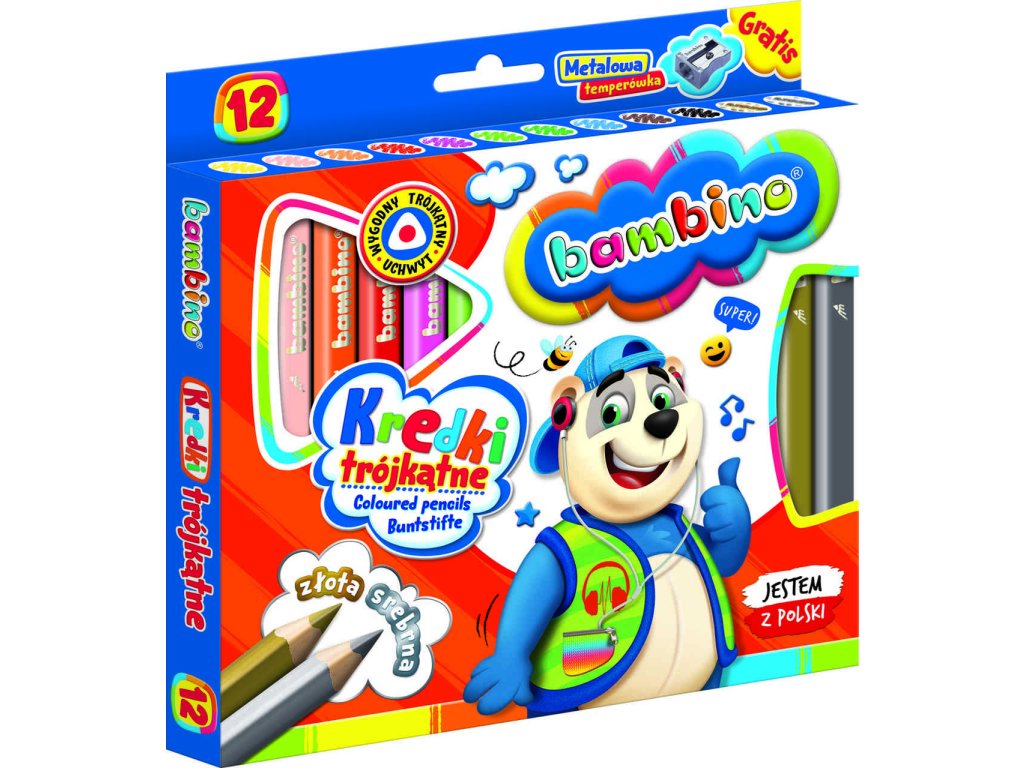 Trojhranné tužky BAMBINO v dřevěném rámečku s 12 barvami a ořezávátkem. Vyrobeno v Polsku z kaolinové hlíny. Ideální pro děti od 3 let, měkké, syté barvy, snadno se temperují. Vynikající krytí povrchu a dokonale přizpůsobené malým rukám. Splňují bezpečnostní normy. Balení obsahuje zlatou a stříbrnou pastelku. Rozměry: 20x9,5x1 cm.