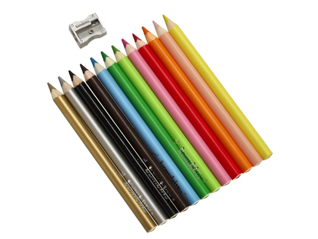 Trojhranné tužky v dřevěném rámečku BAMBINO, 12 barev, s ořezávátkem