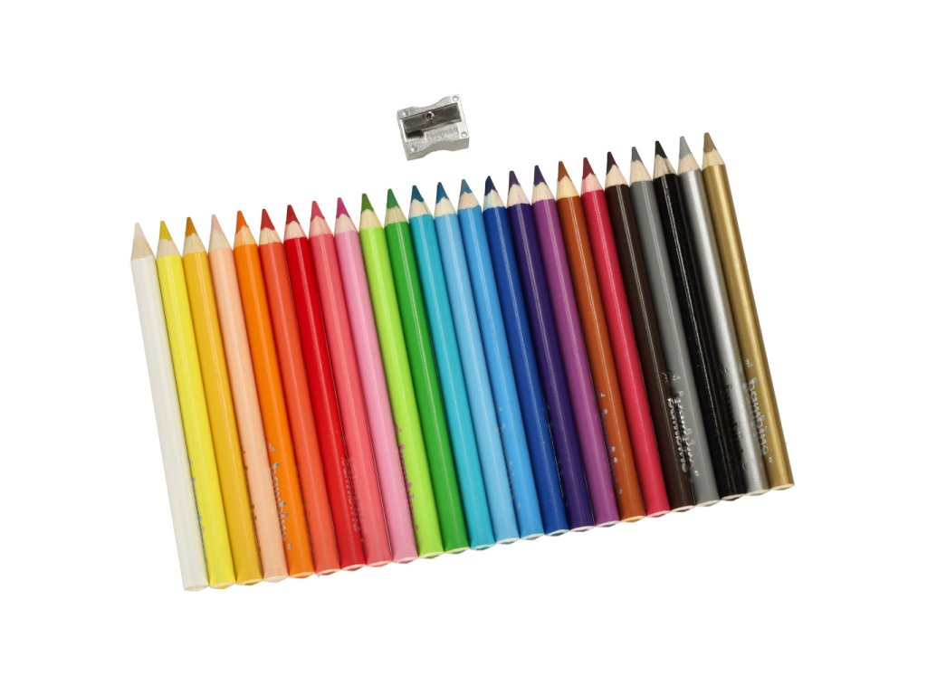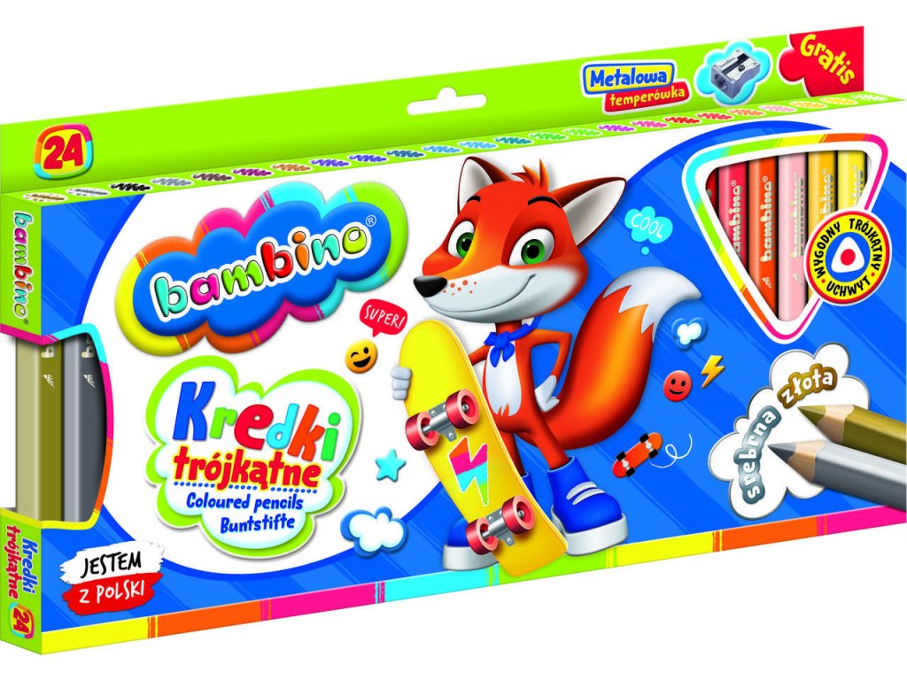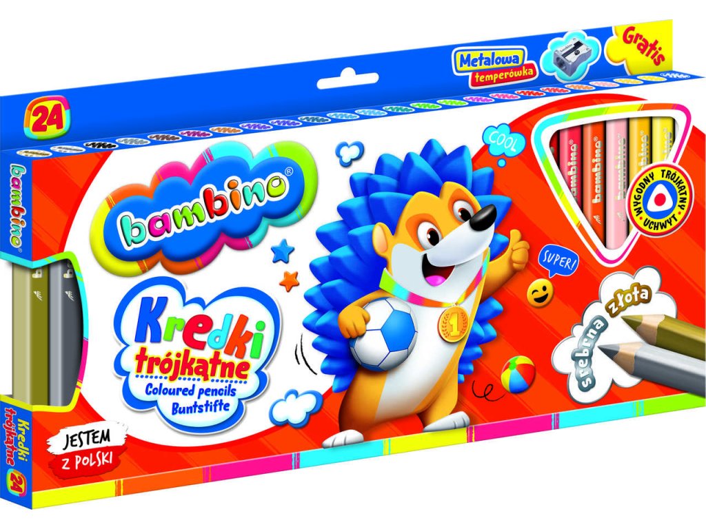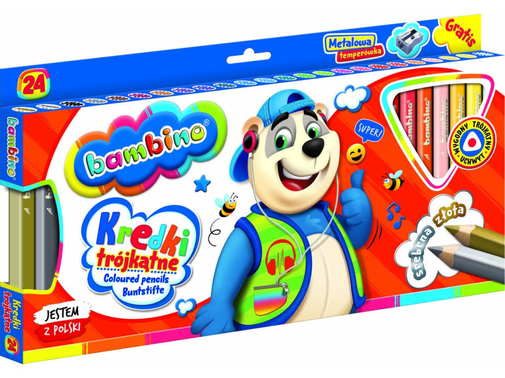 24 barevných trojhranných tužek BAMBINO v dřevěném rámečku s ořezávátkem. Vynikající krytí povrchu, měkké a snadno temperovatelné. Ideální pro děti od 3 let. Splňuje bezpečnostní normy. Rozměry: průřez 10 mm, délka 15 cm, průměr tyčinky 5,3 mm.