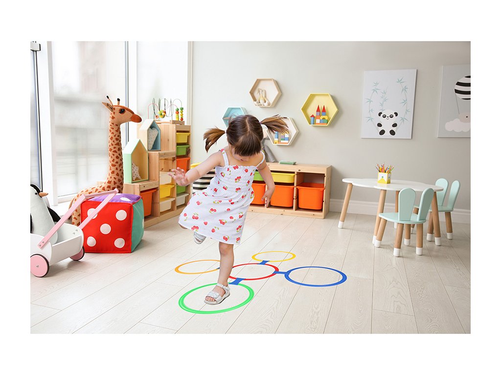 Barevné disky posypou čtverce nakreslené křídou, takže se děti už nemusí omezovat na skákání po chodníku nebo asfaltu. Disky lze umístit kamkoli - v domě, na koberci, na trávě nebo dokonce na pláži!