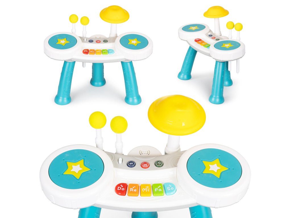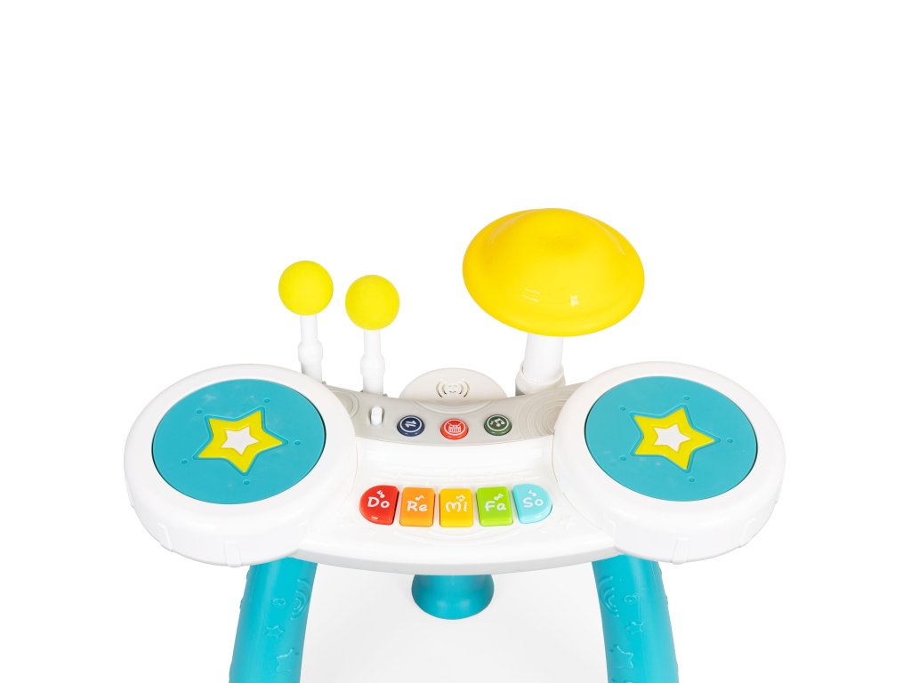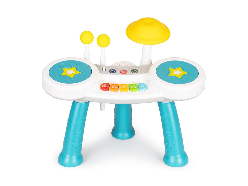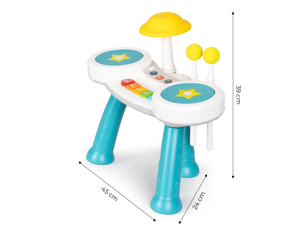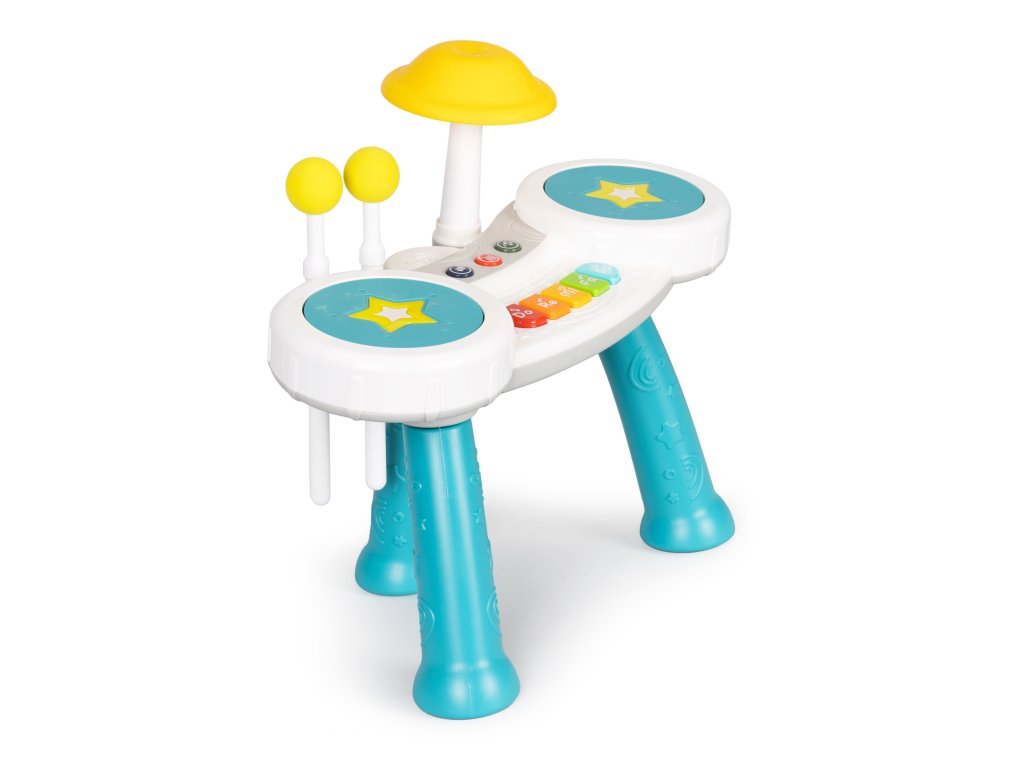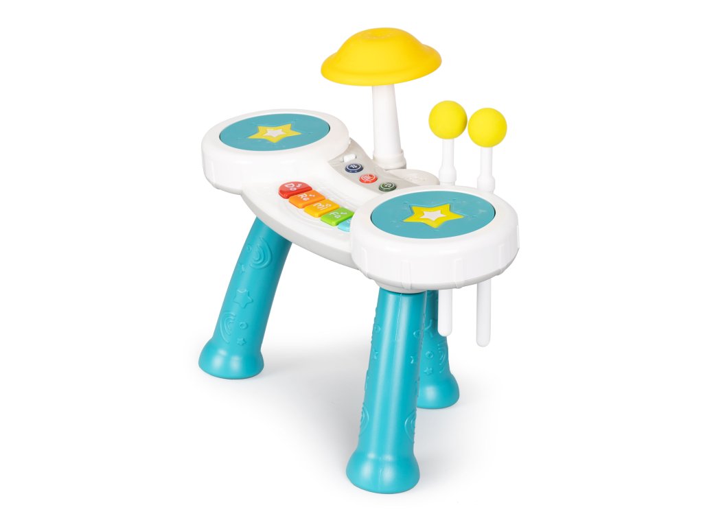 Prostřednictvím dvě doprovodné paličky batole může hrát stejně jako na skutečné bubny. Stačí udeřit do bubnů nebo činelů a slyšet jejich zvuk. Tato hračka je velmi zábavná všechny děti, rozvíjí kreativitu a motoriku. Použití tlačítek můžete změnit režim a typ přehrávaných melodií.