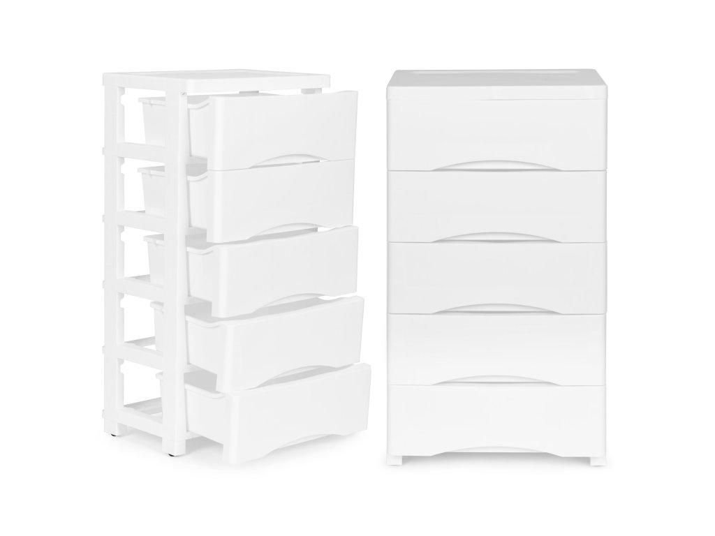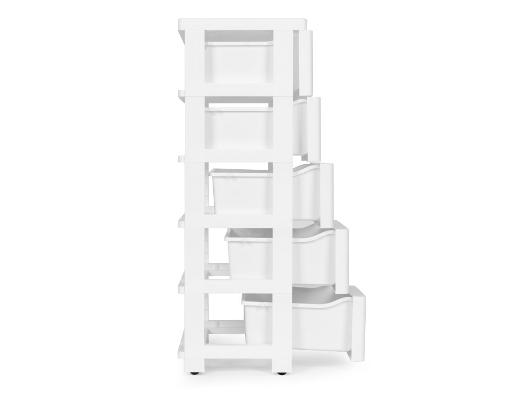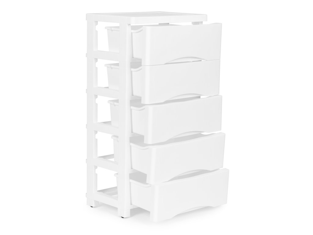 Bílý pojízdný regál na kolečkách s 5 zásuvkami