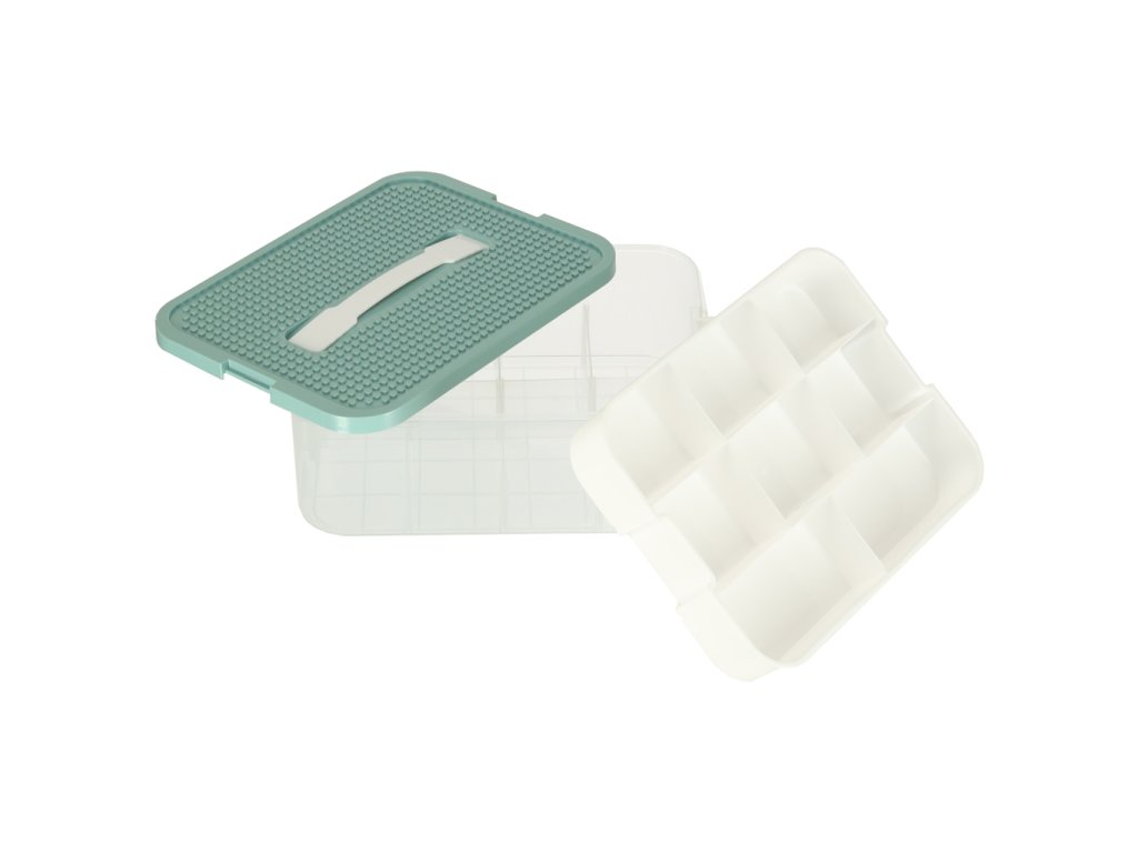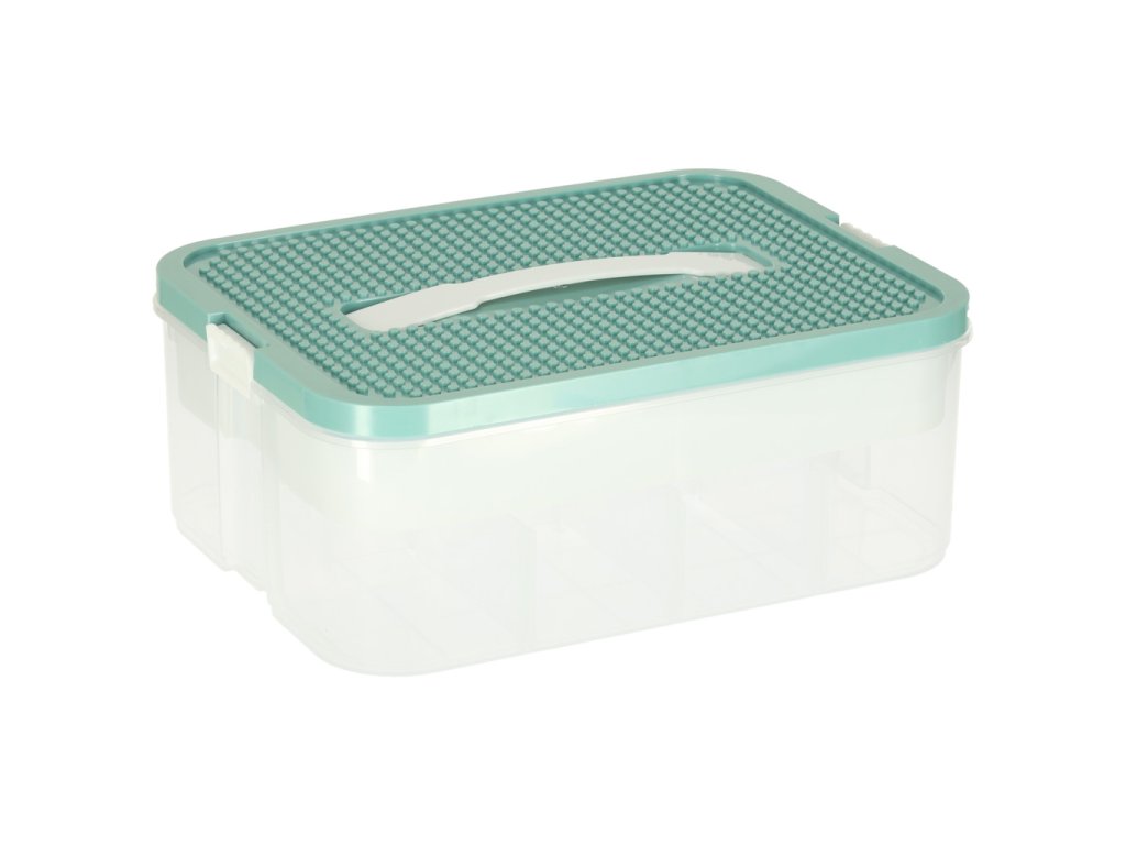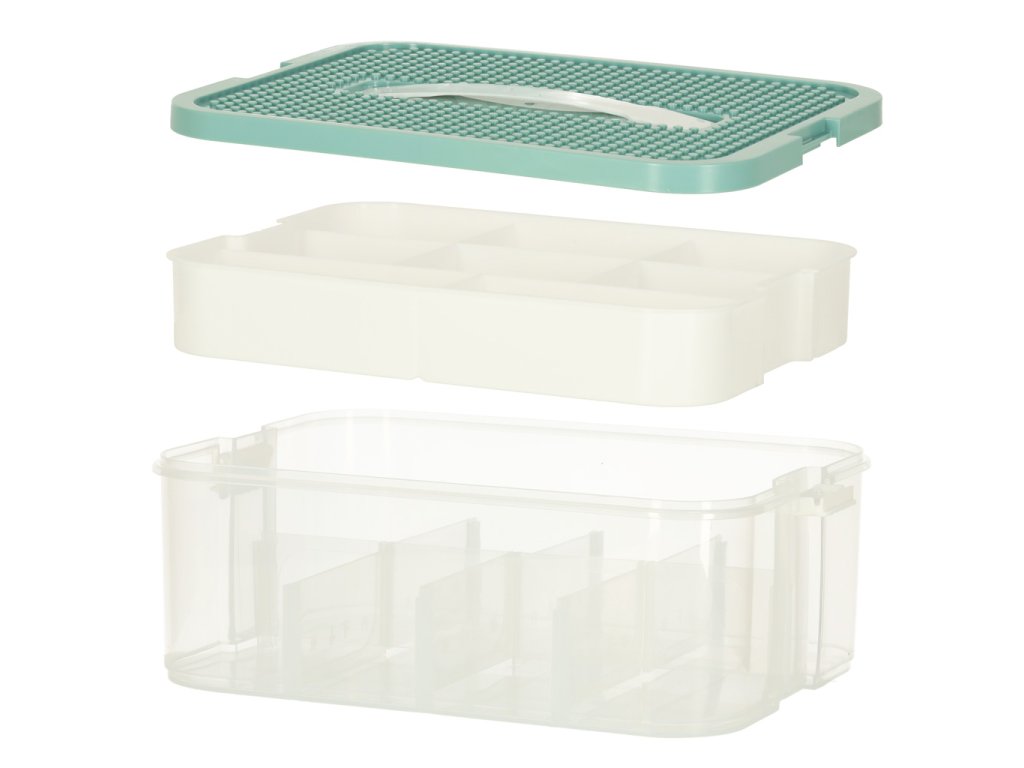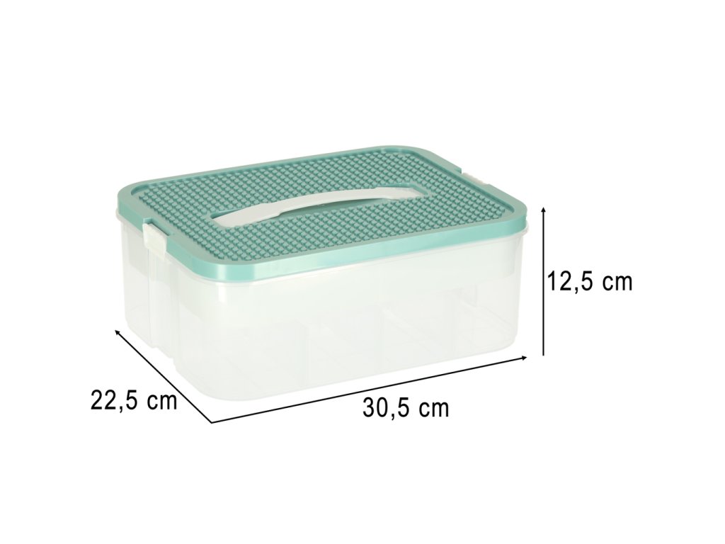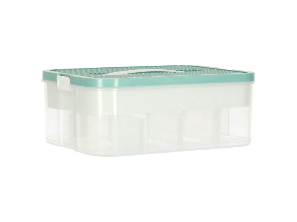 Technické údaje: - Materiál: plast - Barva: Vessel a náplň: Průhledný, bílý Víko tyrkysová- Počet úrovní: 1: - Uzavření: Pevné západky pro zajištění obsahu Rukojeť: Ano - pohodlné přenášení - Modifikovatelné oddíly: Ano - díky přiloženým vložkám - Celkem objem: 8 litrů