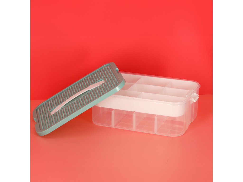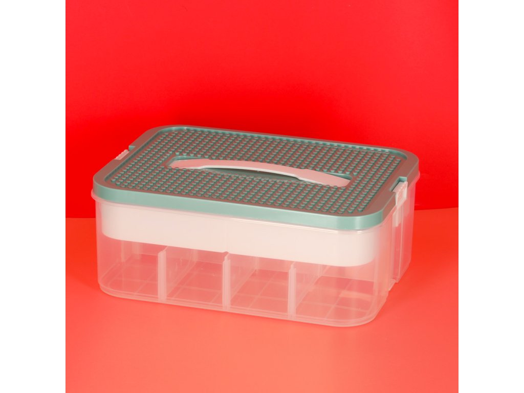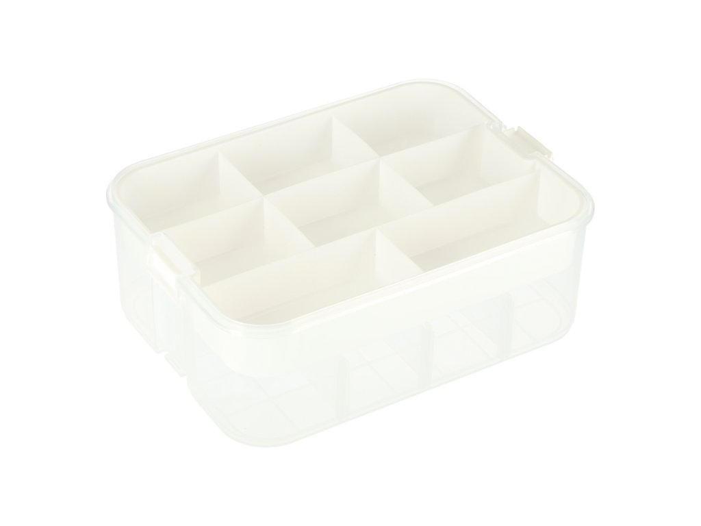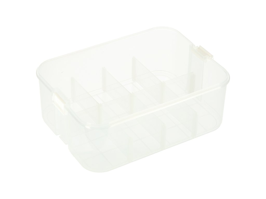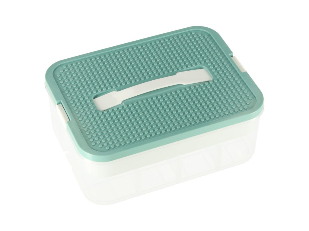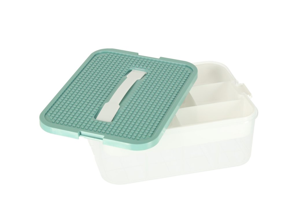 Technické údaje: - Materiál: plast - Barva: Vessel a náplň: Průhledný, bílý Víko tyrkysová- Počet úrovní: 1: - Uzavření: Pevné západky pro zajištění obsahu Rukojeť: Ano - pohodlné přenášení - Modifikovatelné oddíly: Ano - díky přiloženým vložkám - Celkem objem: 8 litrů