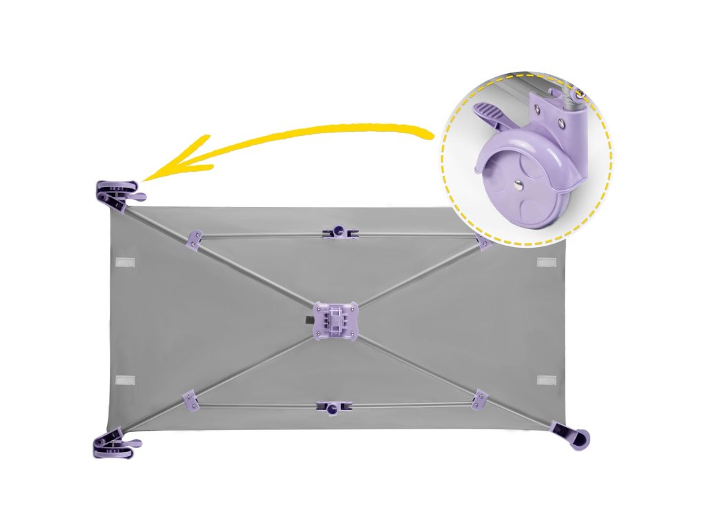 Kola umožňují bezproblémové přemisťování postýlky z místa na místo. Po rozložení ji můžete blok kolečka pro bezpečné umístění.