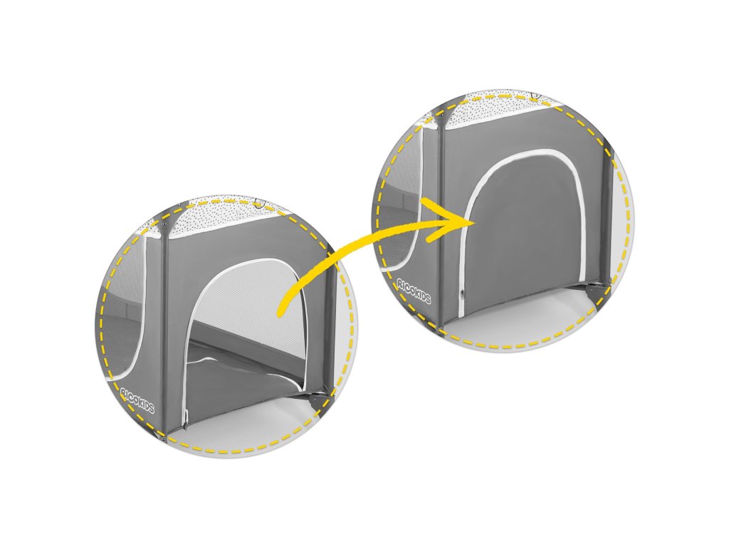 Odnímatelný boční vchod je pro malé děti nerozbitný díkyse zipem našitým na vnější straně. Na druhou stranu umožňuje starším, zdatnějším a mobilnějším osobám být nezávislými,pohodlné a bezpečné nastupování a vystupování z postýlky - tím se zabrání pokusům o vylezení na postýlku.