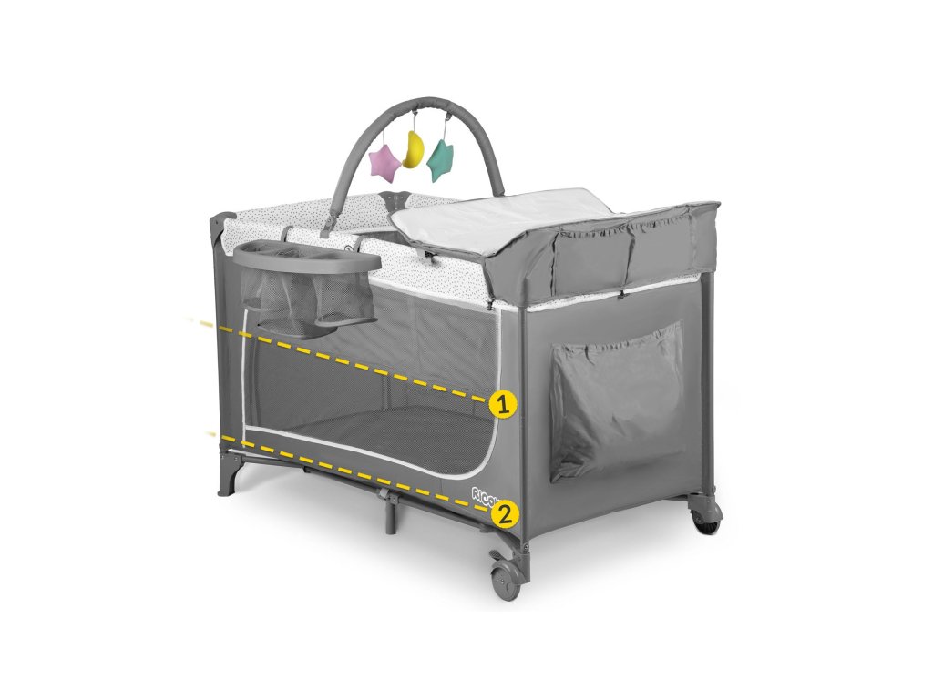 Prostor pro matraci lze zvedat a snižovat. Díky tomu je možné přizpůsobit hloubku lůžka vývojovému stupni dítěte, což vám usnadní péči o dítě a ztíží jeho vypadnutí z postýlky.