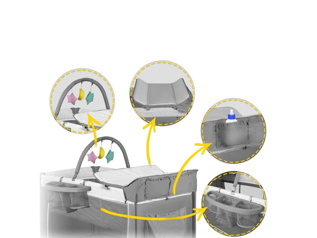 Ke stříšce můžete připevnit hračky a k rámu přebalovací pult, který lze kdykoli odpojit nebo spustit na stranu a používat jej pouze v případě potřeby. K dispozici je také organizér a kapsy na věci potřebné k péči o dítě.