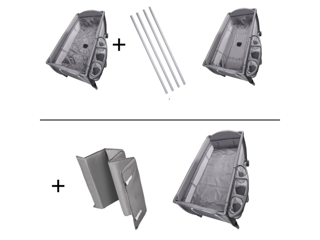 Součástí postýlky je mimo jiné připojitelné druhé lůžko a přebalovací pult s kapsami. Toto vybavení zvyšuje její funkčnost, takže je vhodná jak pro krátké, tak i delší cesty. Díky konstrukci ve tvaru písmene X, protiskluzovým nožičkám a uzamykatelným kolečkům je postýlka praktická a stabilní. Chytře uspořádané kapsy a přihrádky usnadňují vybalování a organizaci zavazadel. Dětská postýlka s přebalovacím pultem poskytuje pohodlí při přebalování a přebalování dítěte.