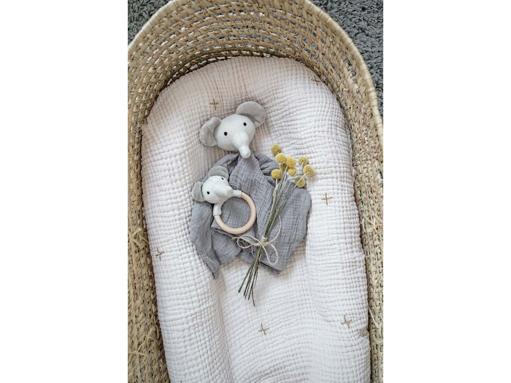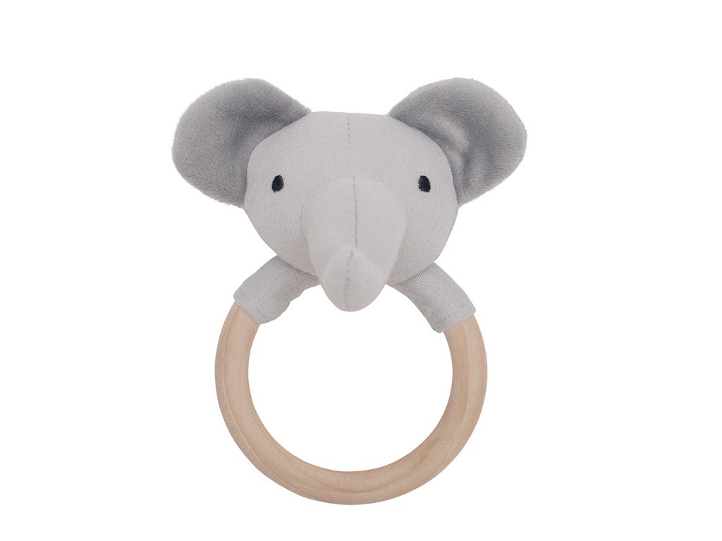 Roztomilé chrastítko ve tvaru slona. Díky dřevěnému kroužku ho mohou malé dětské prstíky snadno uchopit a držet. Jemný zvuk chrastítka je pro miminka dokonalou smyslovou stimulací. Vyrobeno z měkkého plyše s hedvábně hebkýma ušima. Toto chrastítko bude oblíbenou hračkou miminka. Vyrobeno ze 100% polyethylenu a výplně z polyesterových vláken.