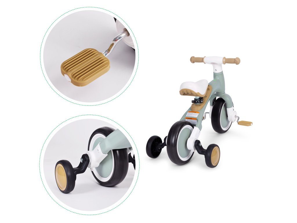 - Přídavná kola lze odpojit uvolněním západky. Byly vyrobeny z odolných materiálů, poskytují pevnou oporu a pomáhají dítěti udržet rovnováhu a jistotu při šlapání. Kola kola jsou bezdušová a přiměřeně měkká, takže kolo lze použít v interiéru i exteriéru.