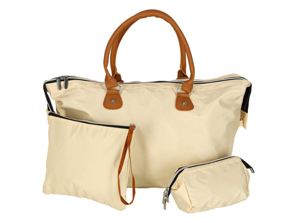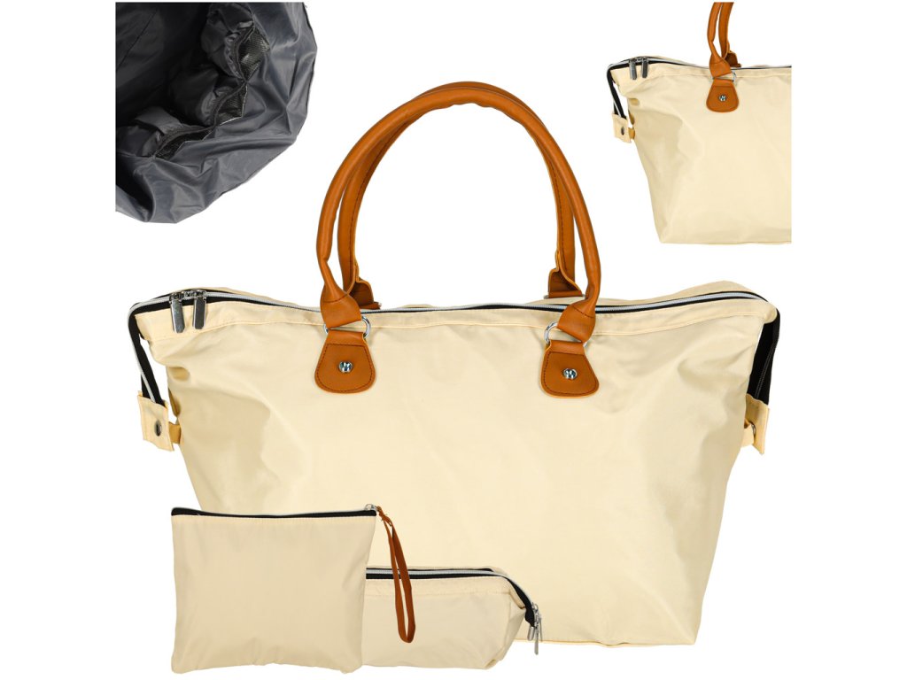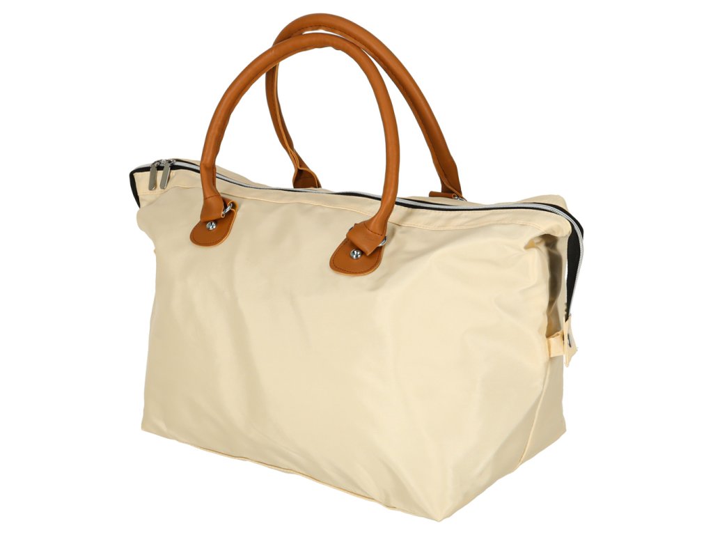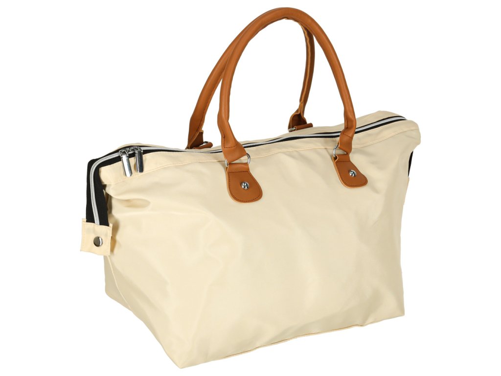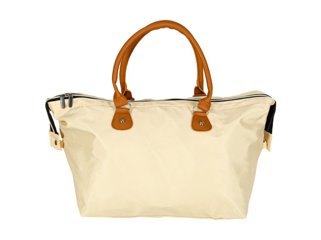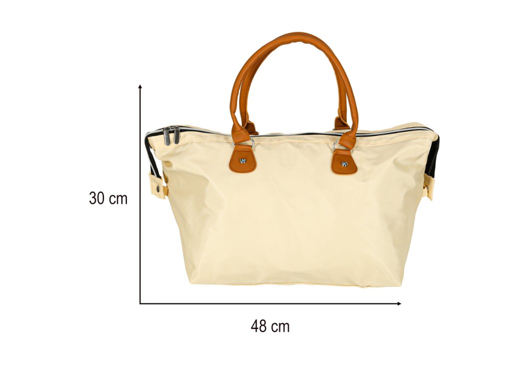 Elegantní béžová polyesterová taška s praktickým zapínáním na zip. Obsahuje velkou kapsu a dvě malé kapsy. Ideální na cesty a do města. Rozměry: 48x30x21 cm.