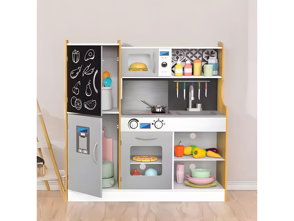 Na kuchyňské lince je varná deska s 2 hořáky, otočný kohoutek a dřez, díky nim mohou děti vařit chutná jídla a pak umývat nádobí ve dřezu. V kuchyni je spousta otvíračů skříněk, které lze použít jako lednice, trouba, mikrovlnná trouba - vše jako ve skutečné kuchyni. Skvělým doplňkem jsou dveře natřené speciální barvou, která je promění v křídovou tabuli, šéfkuchař na ně může napsat svůj recept nebo aktuální menu. Na stěnu lednice se připevní ( suchý zip ) telefon na hraní, která vám umožní být v kontaktu s vaším malým šéfkuchařem.