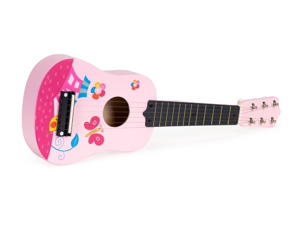 Dětská dřevěná kytara kovové struny růžové trsátko ECOTOYS
