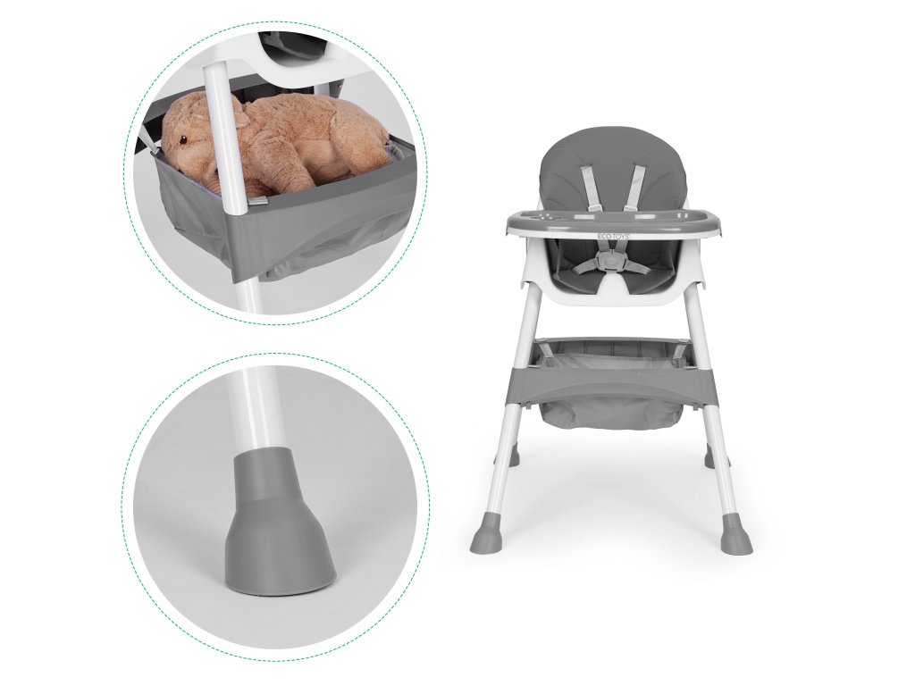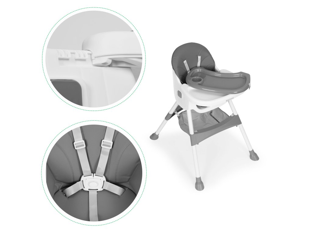Křeslo pro krmení je ideální volba pro všechny rodiče a jejich děti - od 6 měsíců. Usnadněte si konzumaci jídla s dospělými u jednoho stolu, zatímco dítě bude pozorovat, napodobovat a učit se správnému chování. Křeslo za hranicemi moderní design a mnoha funkcemi, dokonale plní svou úlohu a zaručuje bezpečnou a pohodlnou polohu. Díky široký zásobník Batole bude schopno nejen k jídlu, ale i ke hře hrát si, skládat kostky nebo kreslit, takže si vaše dítě svůj nový speciální kus nábytku rychle oblíbí.