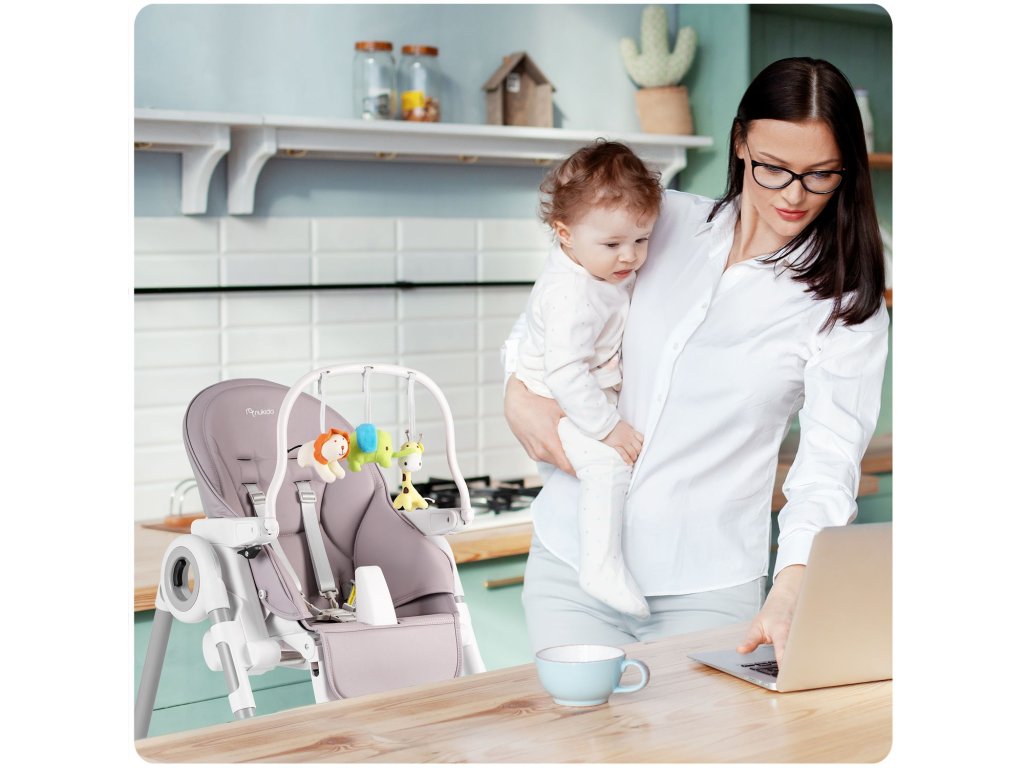 - môžete nastaviť polohu podnosu alebo ho odstrániť, keď chcete dieťa vziať zo stoličky alebo ho priniesť k stolu na rodinnú večeru