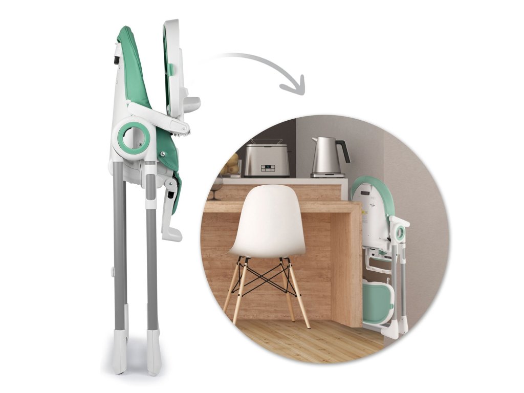- môžete nastaviť polohu podnosu alebo ho odstrániť, keď chcete dieťa vziať zo stoličky alebo ho priniesť k stolu na rodinnú večeru.