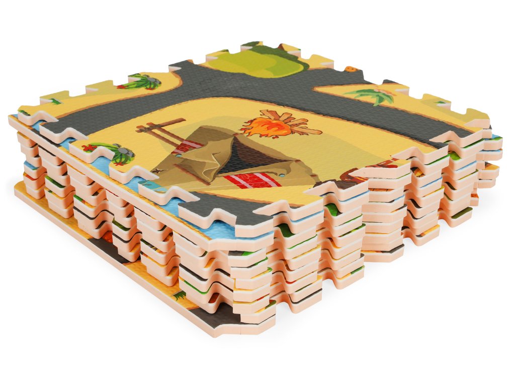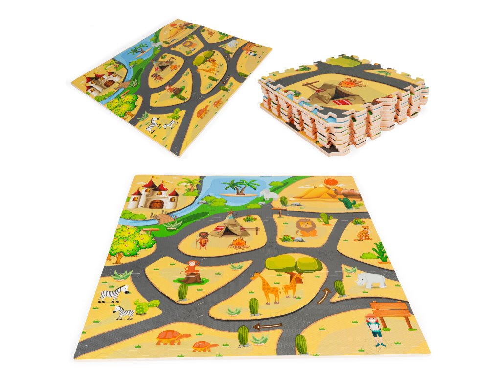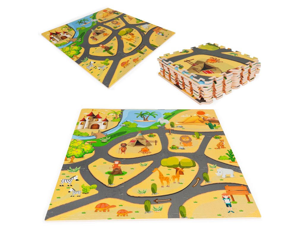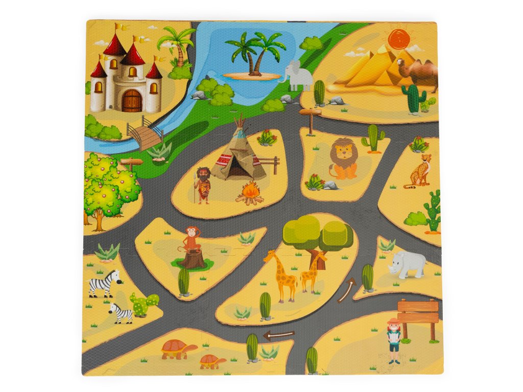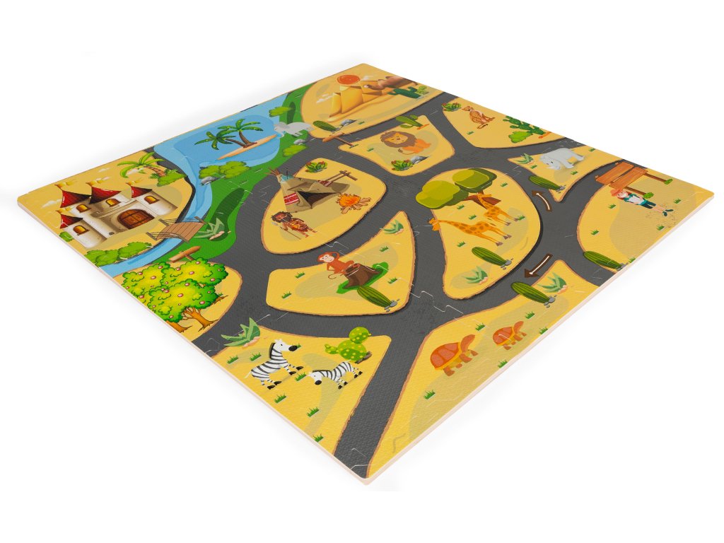 Podložka PUZZLE pro děti od 3 let s barevnou grafikou safari. Vytvořte si vlastní tvar, chrání před chladem, snadno se čistí a je bezpečná. Ideální na hraní, učení se chodit a odpočinek. Vyrobeno ze speciálního certifikovaného plastu EVA.