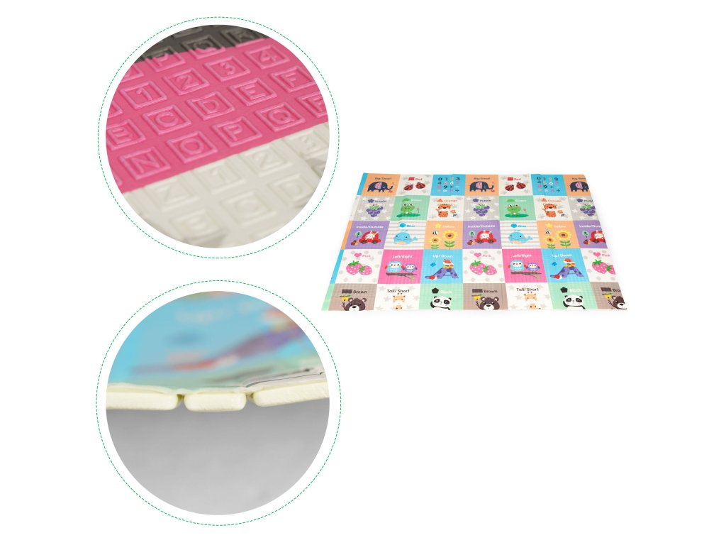 Na jedné straně podložky je vzor ulice, která podporuje hru s vozidly a rozvoj manuálních dovedností. Když je podložka otočena naruby, mohou batolata o objevovat barevné vzory zvířat, ovoce a čísel, která pomáhá rozvíjet dětskou představivost a stimuluje její rozvoj.