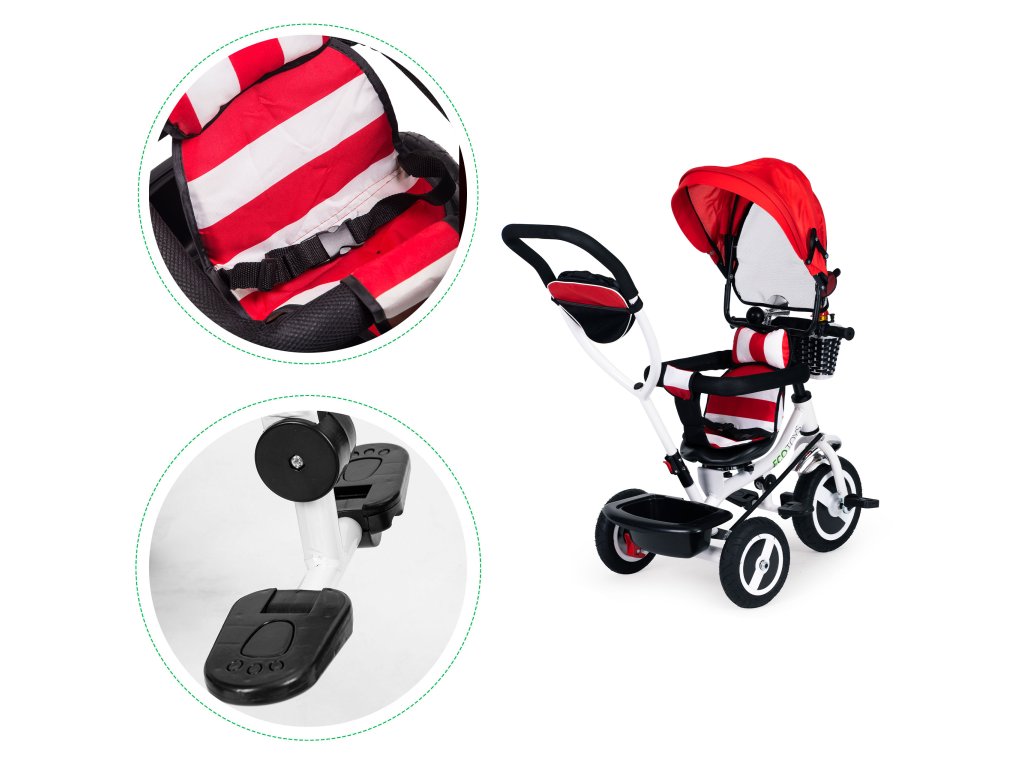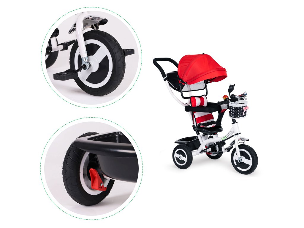 Kolo ECOTOYS kombinuje řadu praktických funkcí, které zajistí, aby vaše dítě pohodlná a bezpečná hra . Kolo má měkké pohodlné opěradlo která umožňuje batoleti pohodlně sedět a bezpečnostní pásy a ochrana proti pádu ze sedadla. Skládací stříška chrání před deštěm a sluncem . Speciálně tvarovaný rám a otočné sedadlo usnadnit nástup nejmenším dětem.