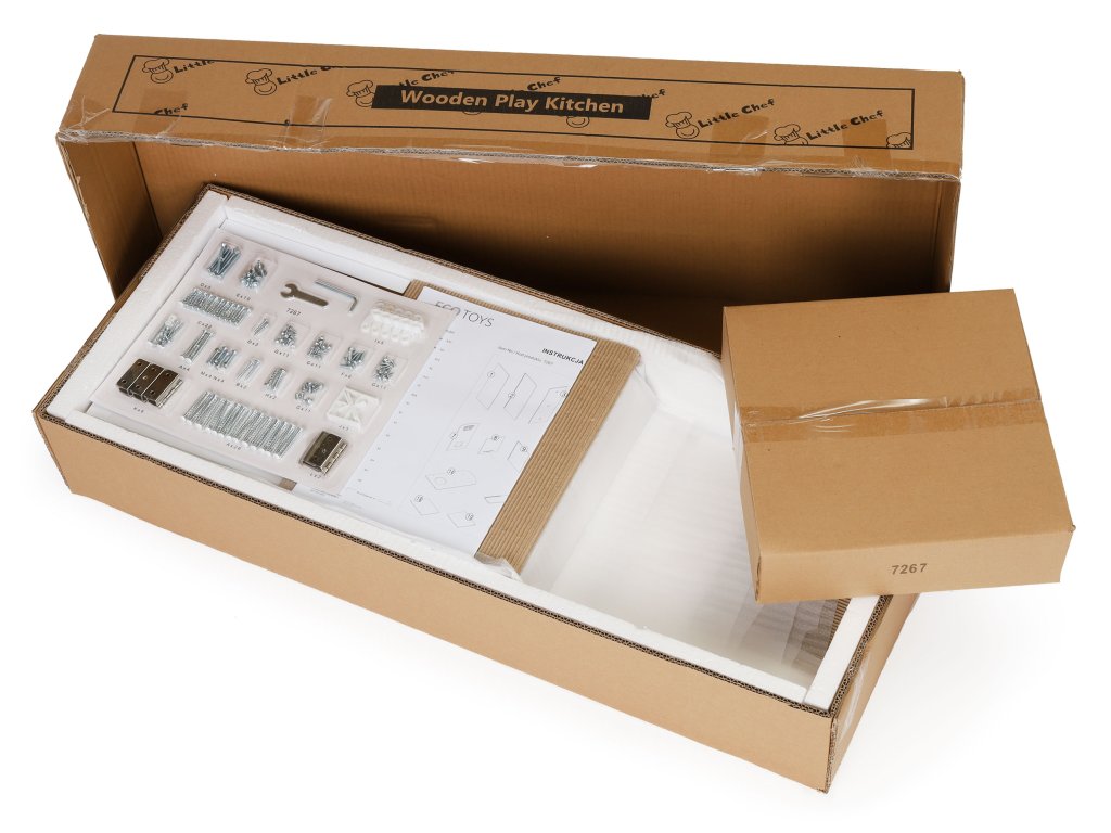 Kuchyně bez nebezpečných součástí a ostrých hran a celá věc byla potažené materiálem bezpečným pro děti barvy . Díky tlumeným a oku lahodícím barvám se hračka skvěle hodí do dětských pokojů, heren a určitě i do pokojíčků přitáhne pozornost všech dětí.