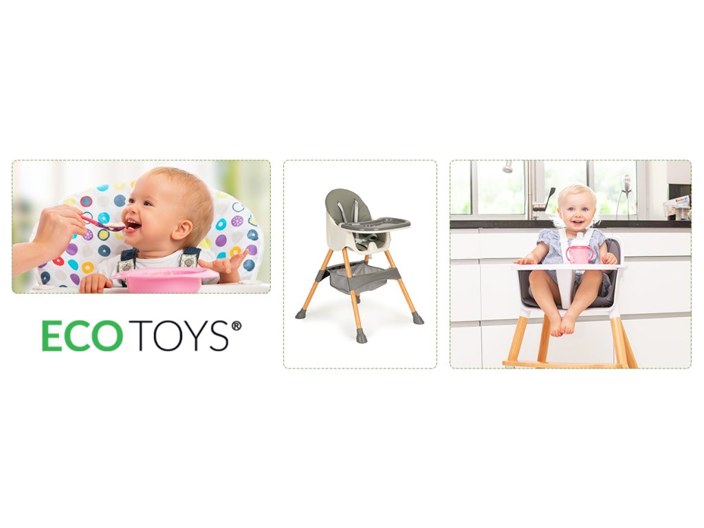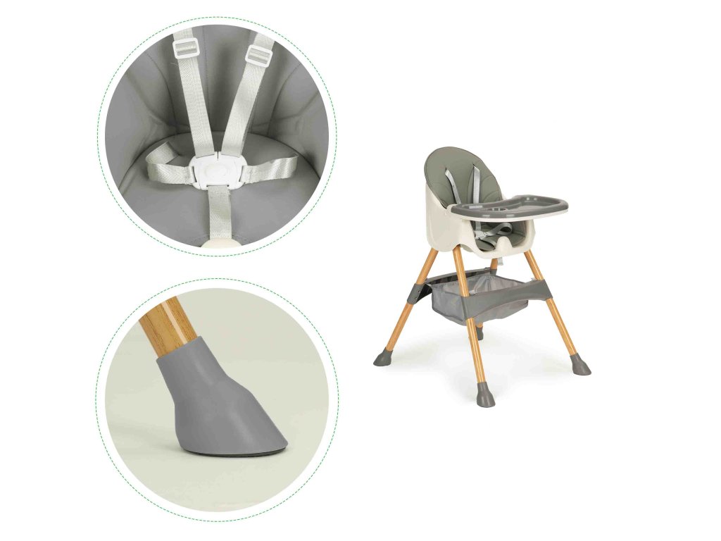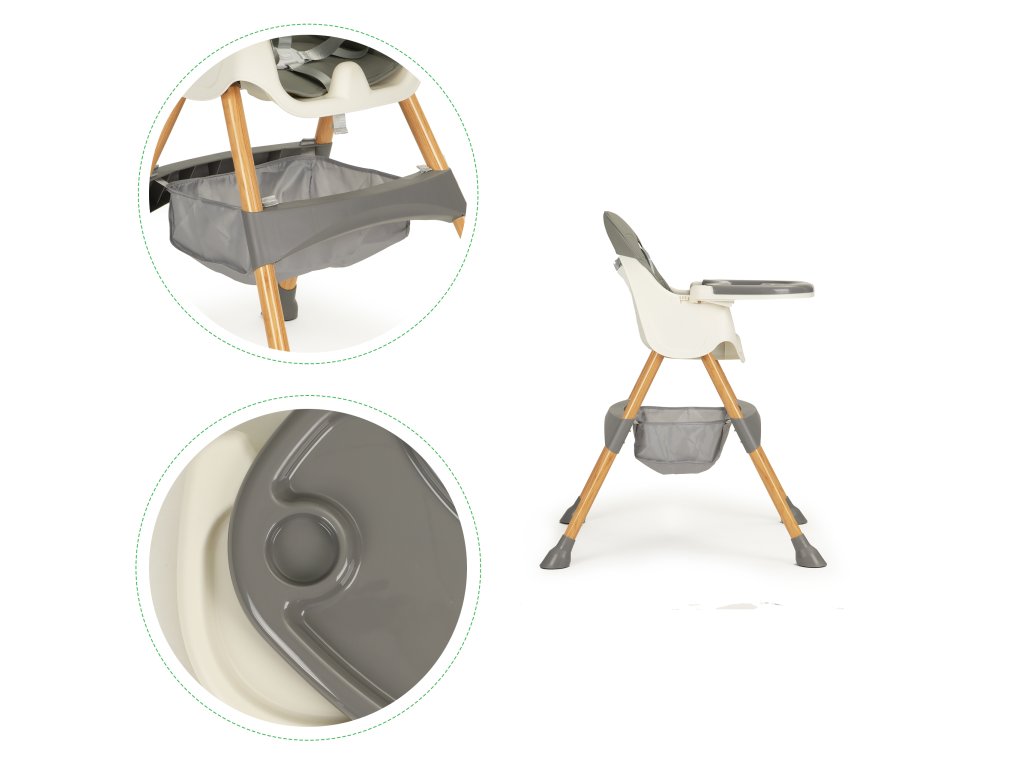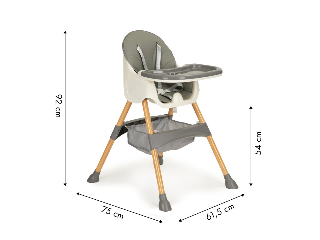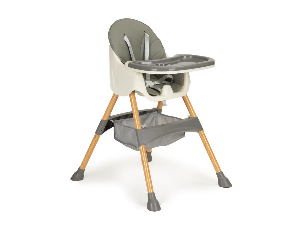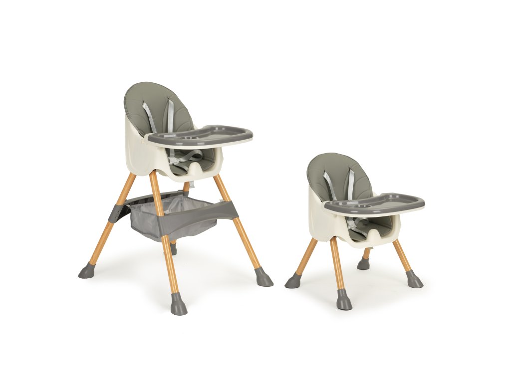 Židle má možnost změny výšky. Nohy a opěrku nohou lze snadno odejmout a z vysoké židle udělat nižší židli. Pokud se vaše dítě osamostatňuje a vy už na něj nemusíte během jídla dohlížet, bude pro něj nižší židlička ideální.