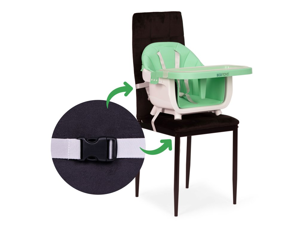 Tuto praktickou židli lze lze snadno připevnit ke standardní židli, aby dítě mělo u stolu svůj vlastní bezpečný prostor. Po odstranění nožiček, sedák lze snadno připevnit k jakémukoli typu židle v domácnosti a přiložené popruhy jej dále upevňují a stabilizují. Takové řešení v ideálním případě se osvědčí na rodinných výletech a cestách.