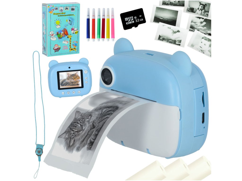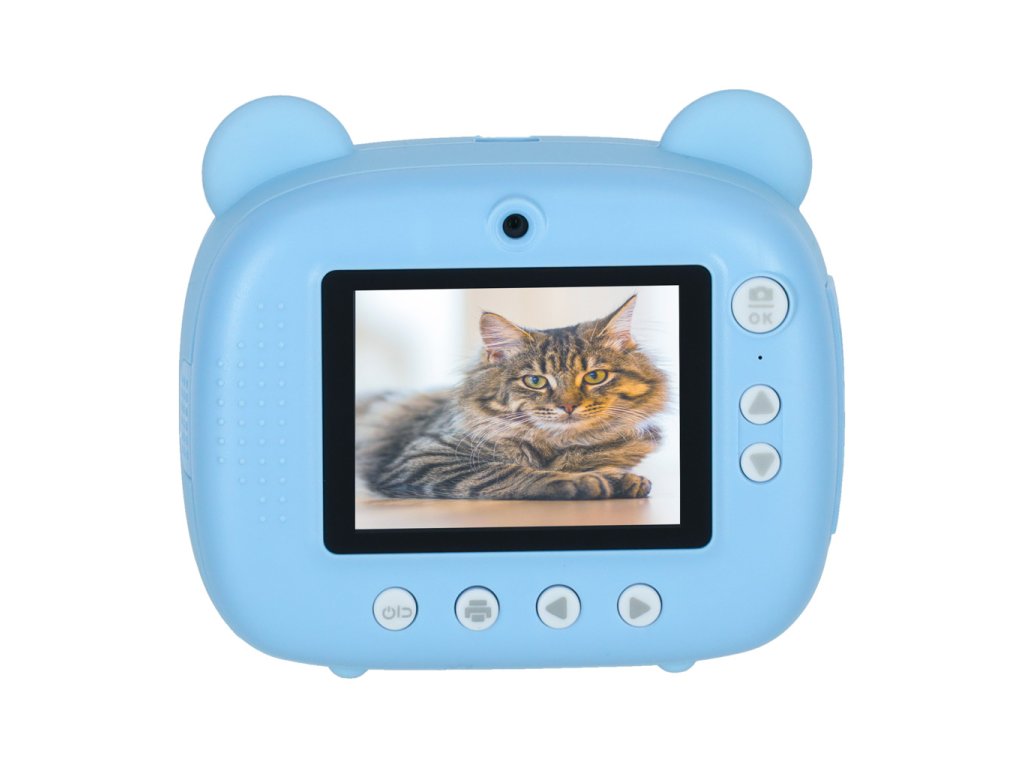 Kamera s kvalitním záznamem 1080p a modrou barvou. Obsahuje režimy MP3 a přehrávání i herní režim. Rozměry kamery: 10,5 cm x 9 cm x 4 cm. V balení najdete kameru, role papíru, šňůrku, kabel USB, paměťovou kartu a fixy.