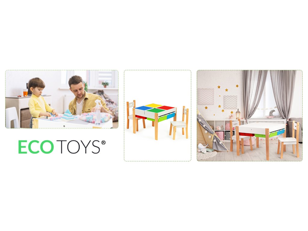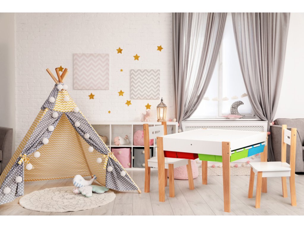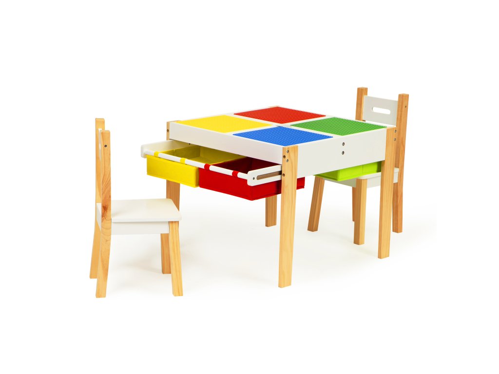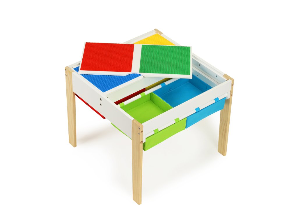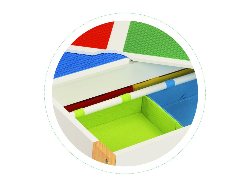 Tabulka bude užitečná jako místo, kde vzniknou umělecká díla malých umělců, blokové věže a mnoho dalších kreativních věcí. Po skončení hry se všechny přídavky lze je uložit pod pracovní desku, aby byly vždy po ruce, připraven k použití. Jsou zde 4 prostorné přihrádky, do kterých se vejdou kostky, hračky, kreslicí potřeby a dokonce i knihy.