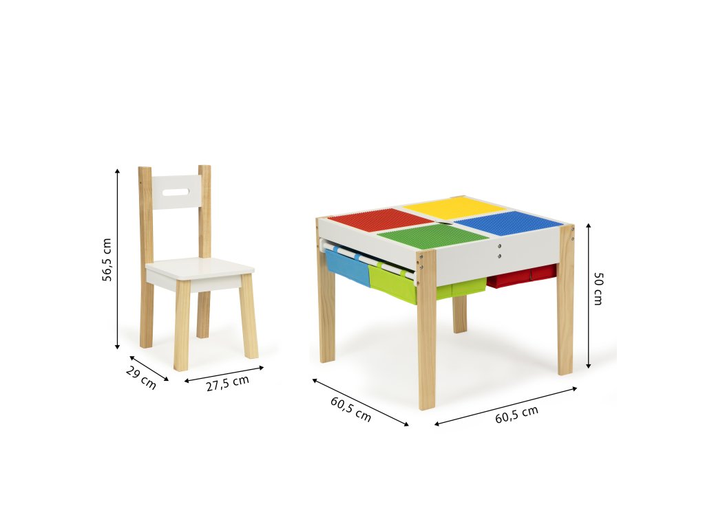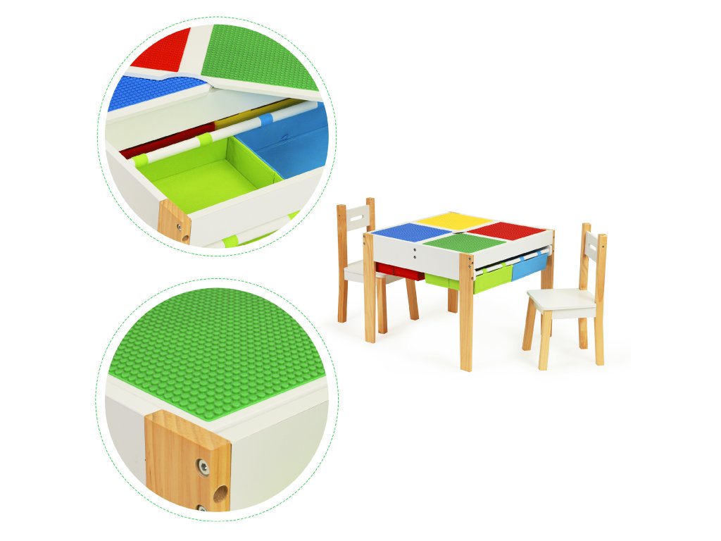 Deska stolu se skládá z 2 odnímatelné prvky. Na jedné straně jsou barevné desky pro ukládání bloků, druhá strana je rovná plocha, umožňuje kreslení, malování a další kreativní hry
