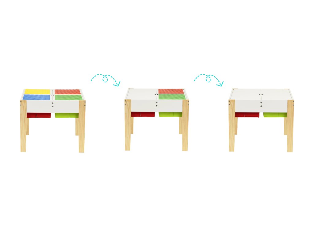 S možností otáčení horních částí, stůl lze dokonale přizpůsobit pro hraní, pokud chce jedno dítě kreslit a druhé skládat bloky, jednoduše otočte jeden z prvků tabulky.