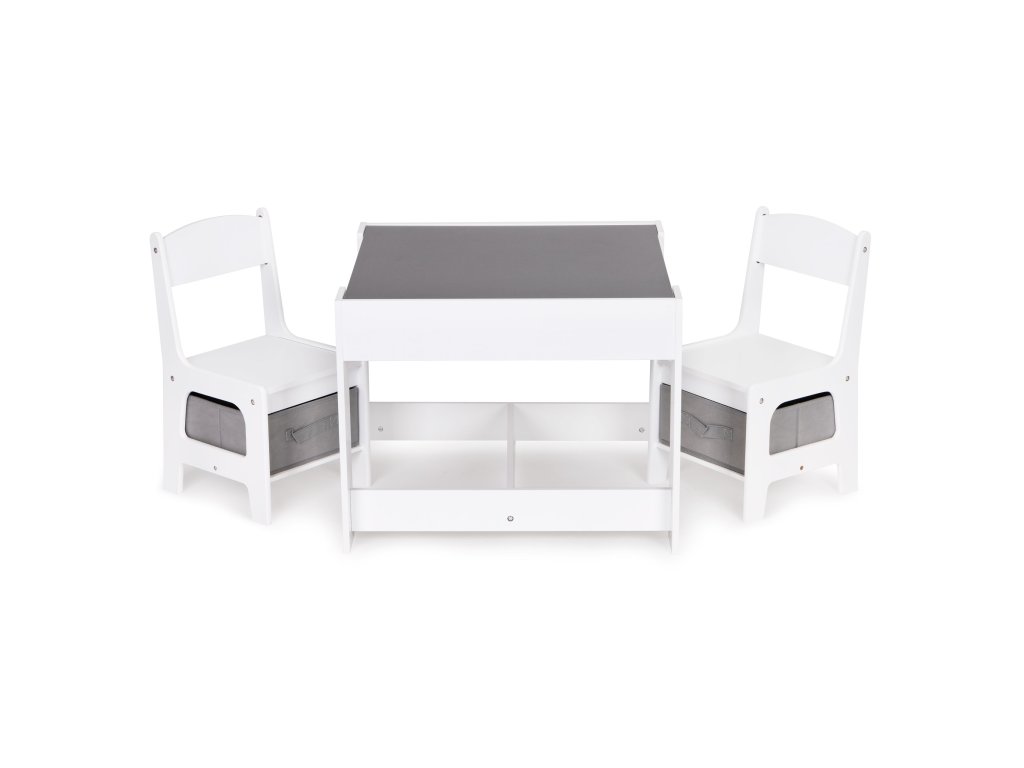 Skvělá sada pro všechna batolata díky jednoduchému tvaru se skvěle hodí do interiéru dětských pokojů, heren nebo čekáren. Sada je vyrobena z MDF, díky čemuž je možné je odolný proti poškození/poškrábání. Sada je doplněna o dvě stabilní a pohodlné židle, které mají funkční koše pod sedadlem, ideální pro ukládání hraček.