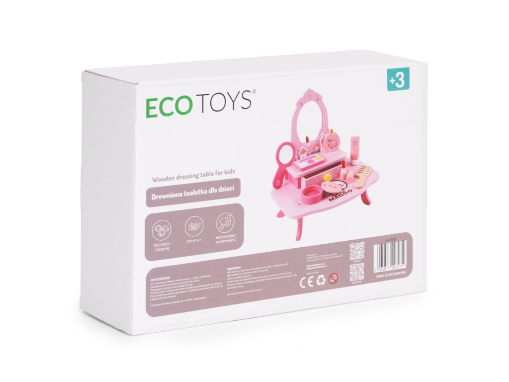 Hra s toaletným stolíkom ECOTOYS je viac ako len zábava - je to skvelá príležitosť pre vaše dieťa, aby napodobňovať dospelých rozvíjať kreativitu a učiť sa hrou. Vďaka bezpečným dreveným doplnkom môže batoľa predvádzať každodenné rituály starostlivosti o telo a zároveň sa učiť udržiavanie poriadku a rozvoj manuálne zručnosti . Farebný toaletný stolík podporuje samostatné činnosti, budovanie estetického cítenia a sebavedomia. Je to ideálna voľba pre rodičov, ktorí chcú dať svojmu dieťaťu niečo krásne a hodnotné.
