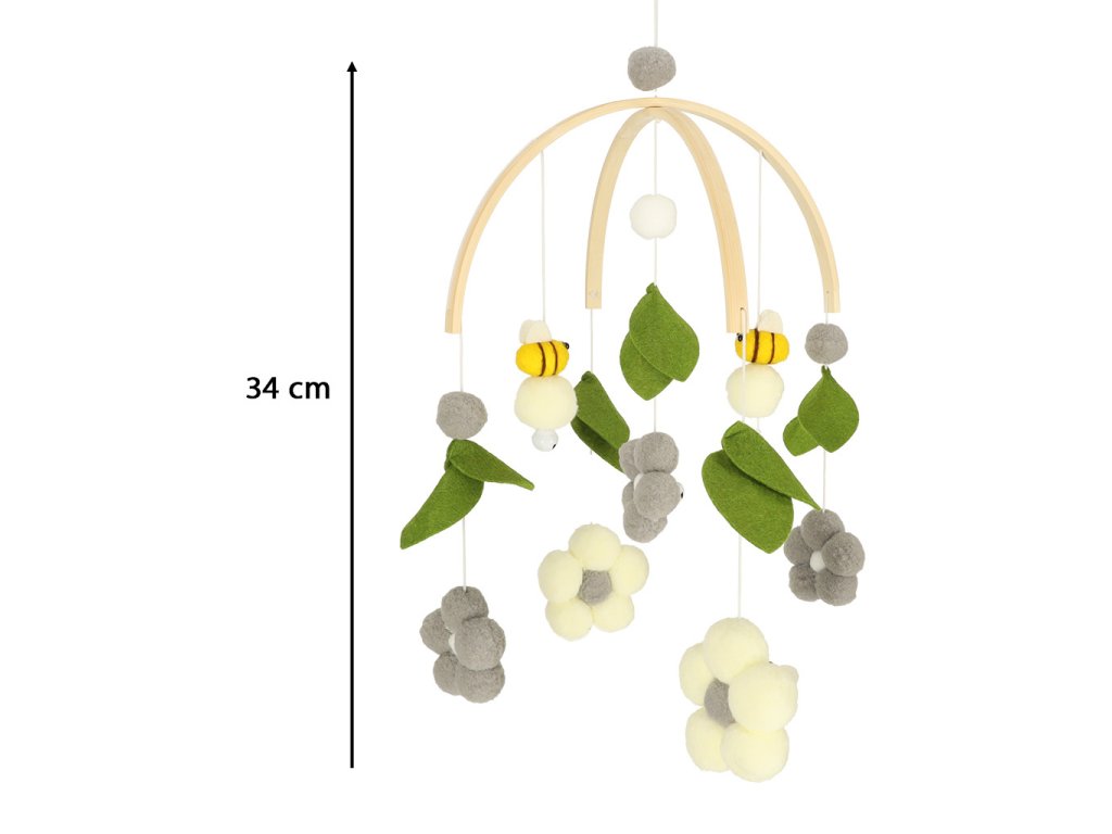 Přívěsky jsou z měkké bavlny a konstrukce kolotoče je vyrobena z hladce obroušené dřevo . Mezi květy jsou navíc umístěny malé zvonky.