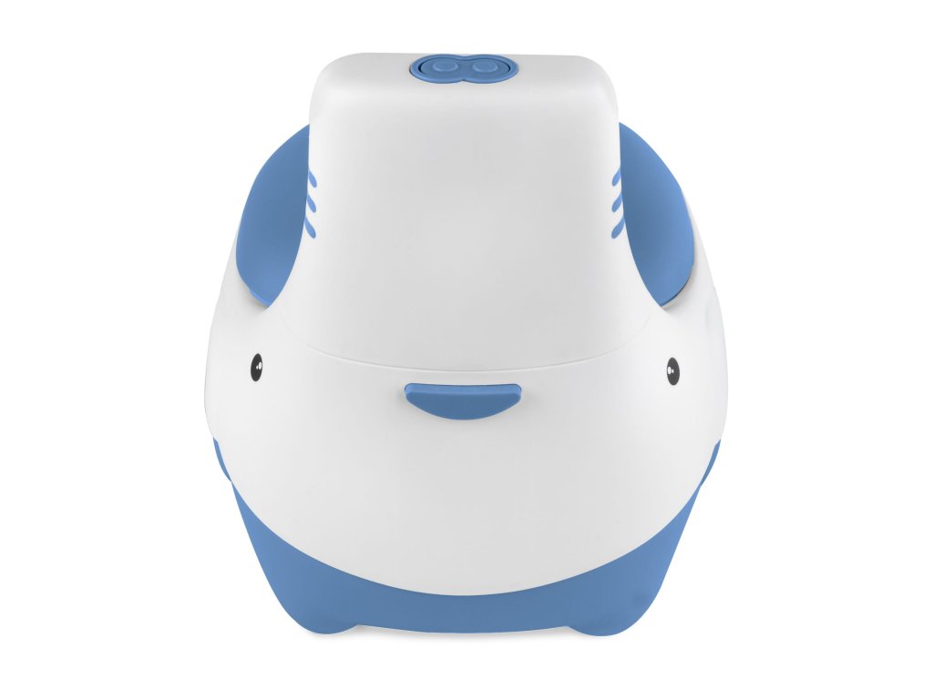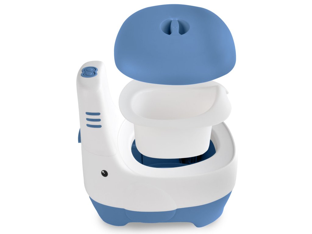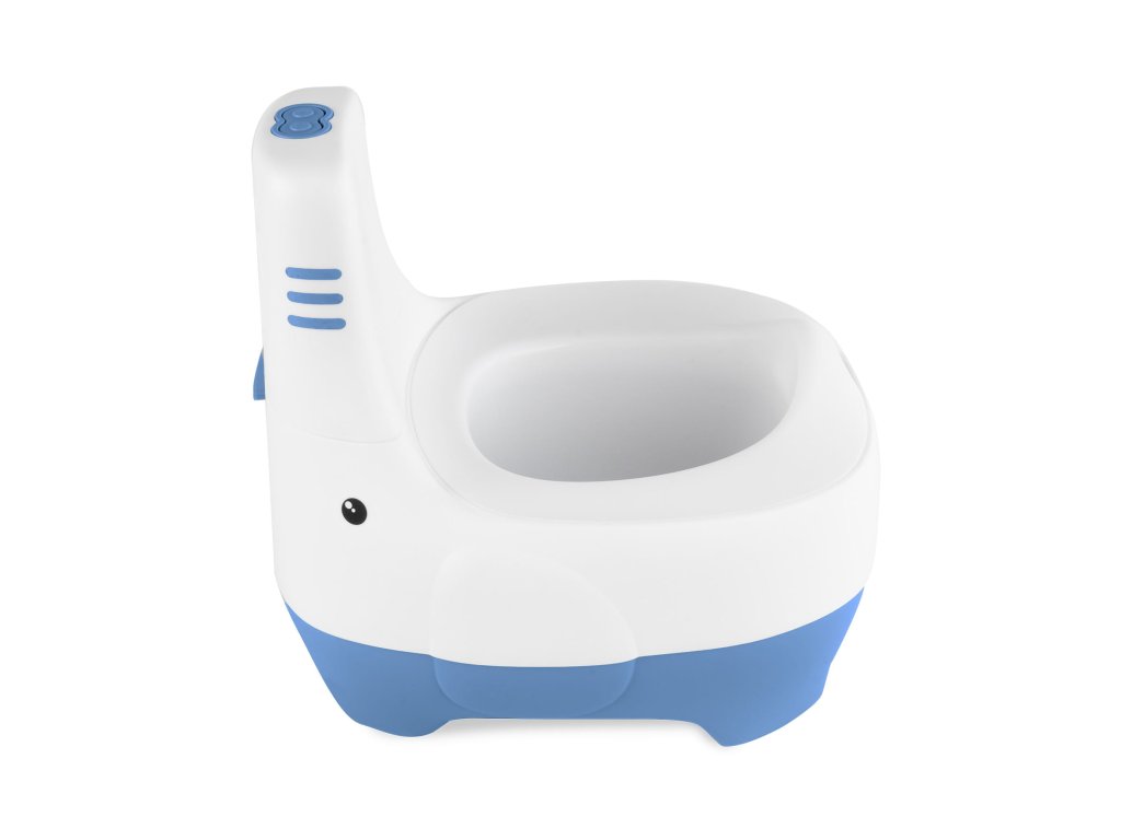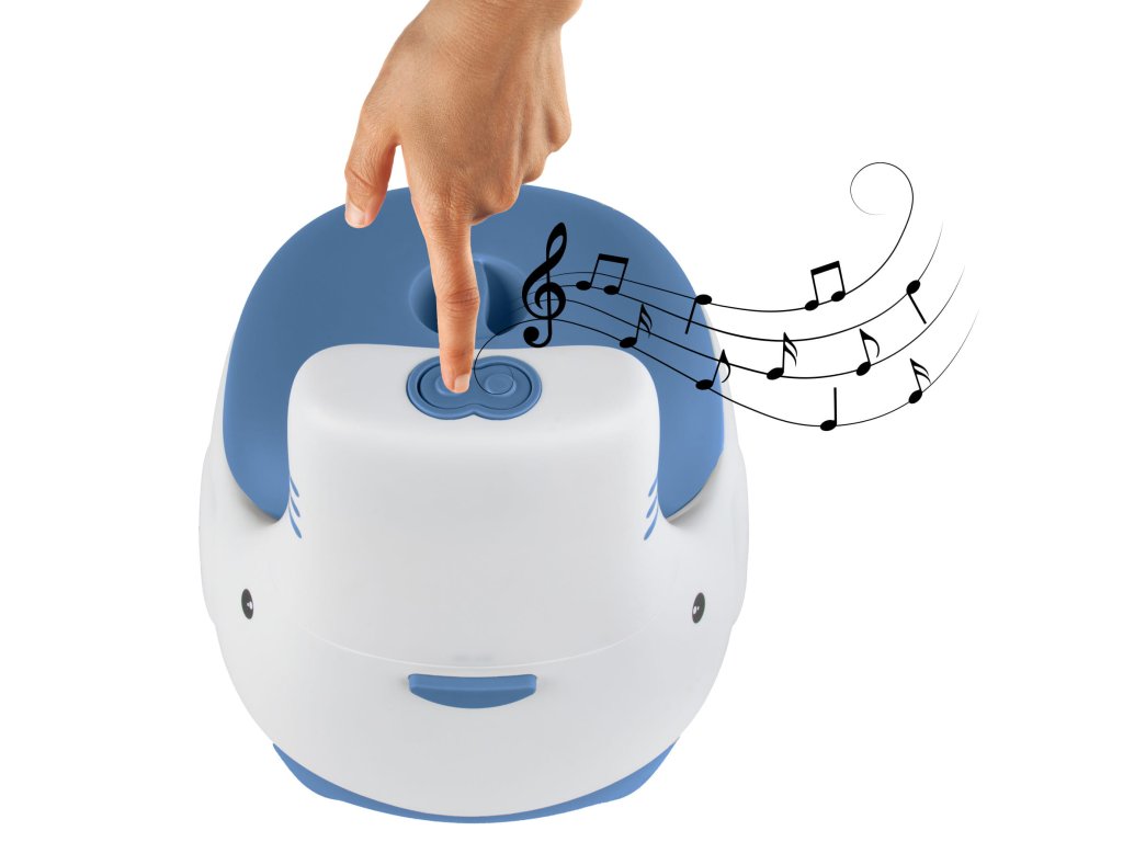 Tlačítko zabudované v opěrce zad aktivuje zvuk splachování vody, který pomáhá dítěti používat nočník se zájmem a zaujetím. Zároveň se tak dítě připravuje na používání skutečného záchodu.