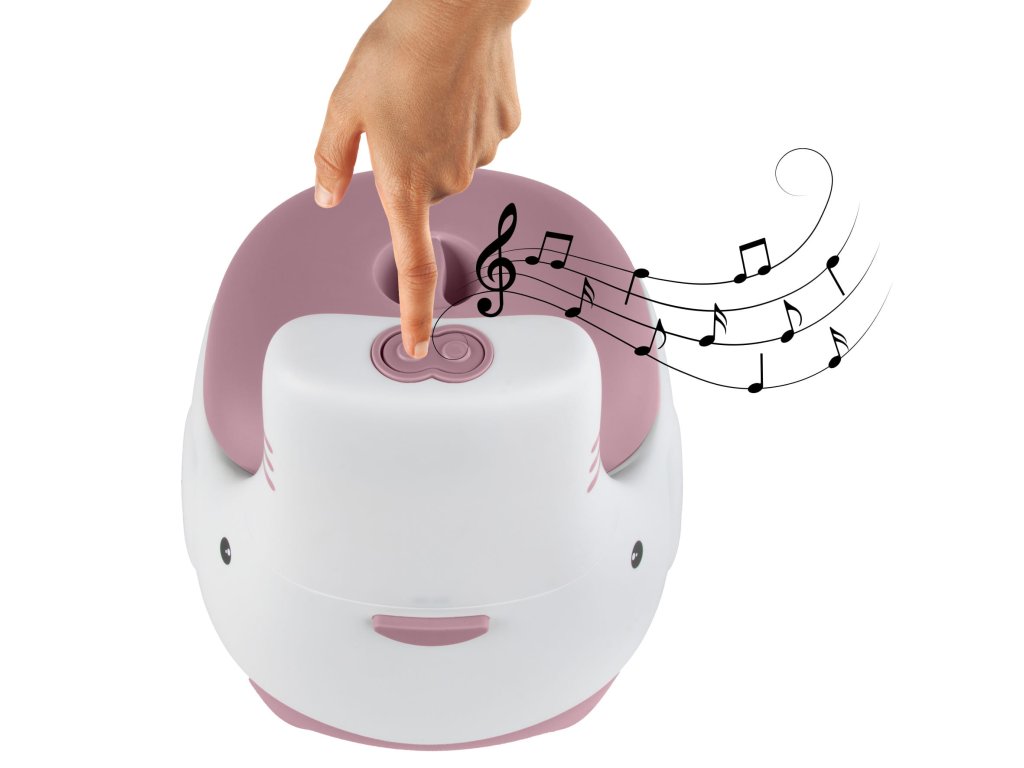 Tlačítko zabudované v opěrce zad aktivuje zvuk splachování vody, který pomáhá dítěti používat nočník se zájmem a zaujetím. Zároveň se tak dítě připravuje na používání skutečného záchodu.